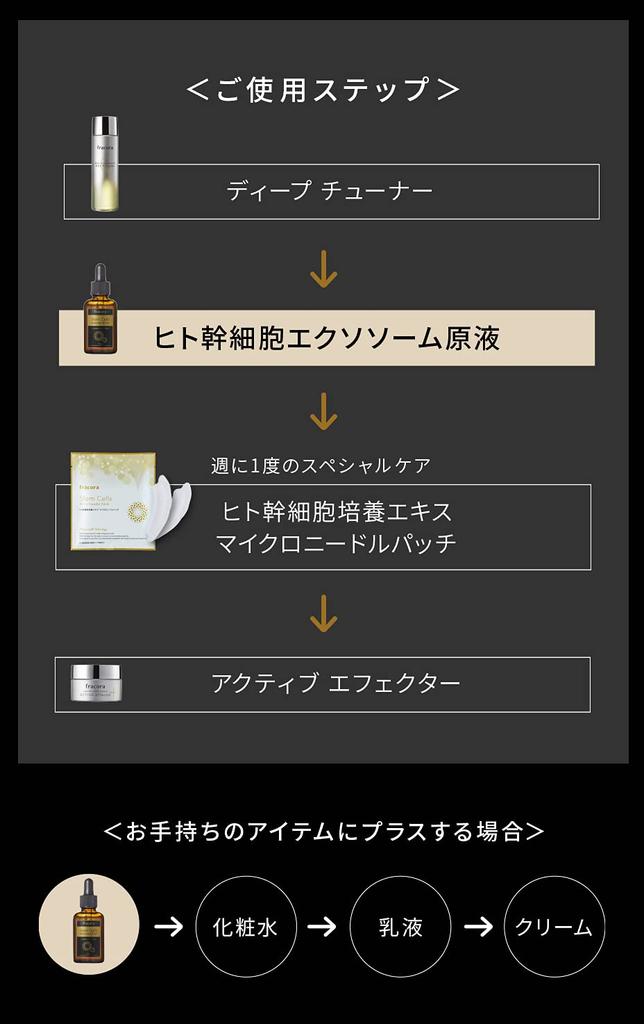 [Пункт 2] Значительно более мощный, чем «обычный тип» благодаря совместным исследованиям с «Anti-Aging Co., Ltd.». Чем больше «экзосом», тем сильнее будут функции различных косметических ингредиентов. Однако «экзосомы» встречаются крайне редко, а их количество, изначально содержащееся в экстракте культуры стволовых клеток человека, крайне мало.. Поэтому было сложно выделить экзосомы и объединить их с липосомальными экстрактами.. Компания Fracola завершила создание уникального «экстракта культуры стволовых клеток человека гибридного типа», используя уникальную технологию, совместно разработанную с «Anti-Aging Co., Ltd.».