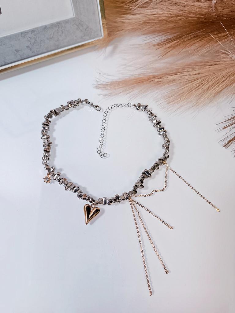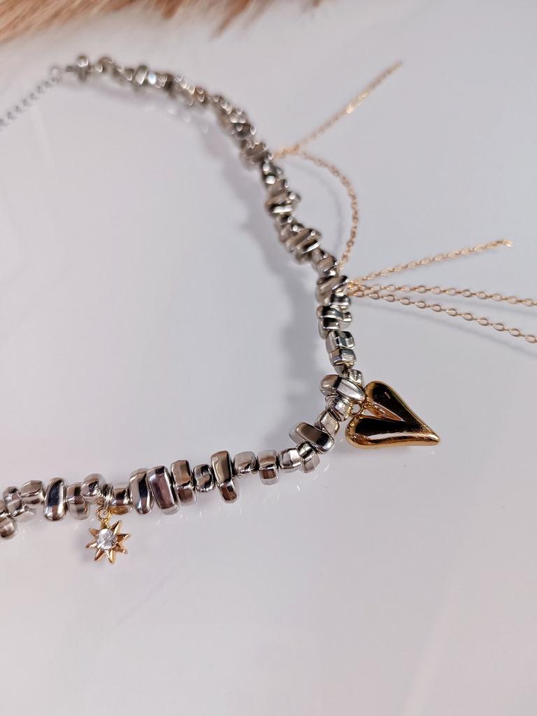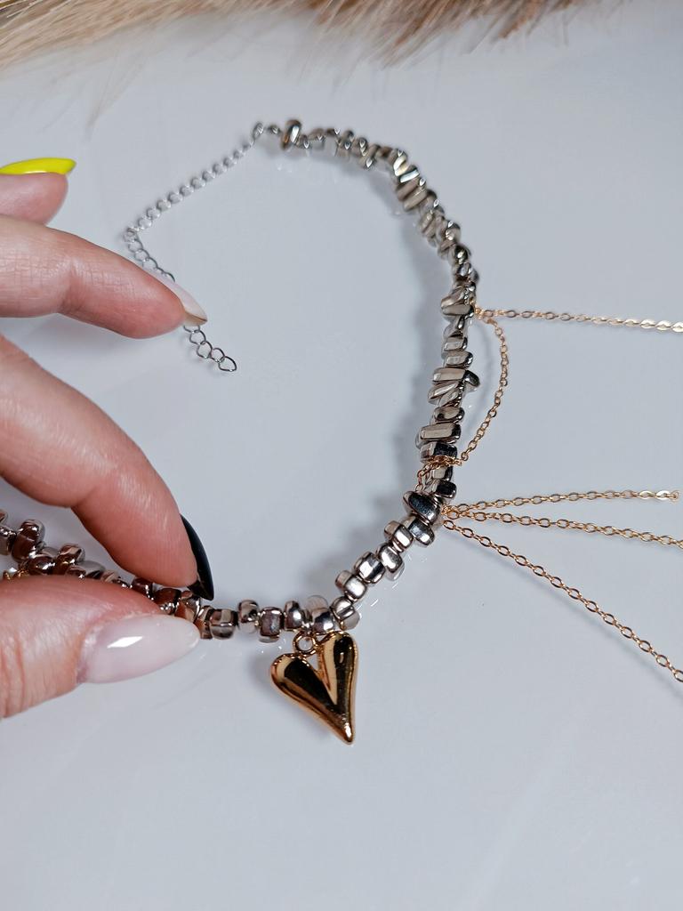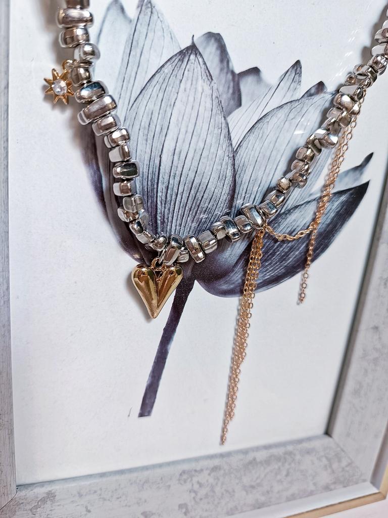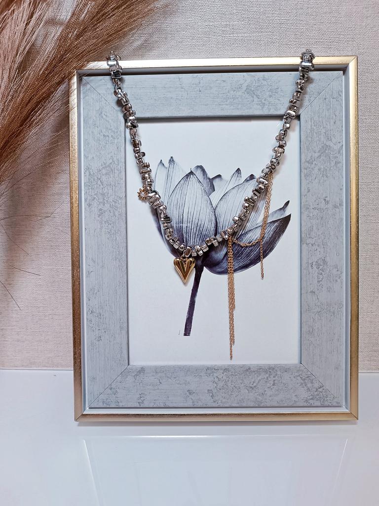 ЭФФЕКТНОЕ ОЖЕРЕЛЬЕ -ЧОКЕР🔥 Прекрасное дополнение к образу! Привет 👋 С древних времён люди привыкли себя украшать! Это возможности выразить себя, завершил образ, привлечь внимание Я обожаю покупать украшения на Джум. Делаю это часто и всегда одна рука покупает выбранное, вторая уже тянется за чем -то ещё интересным) Сегодня покажу вам такое необычное ожерелье. Оно привлекает внимание и выглядит сложносочинённым, хочется рассматривать. Я часто думаю,что не зря наши предки закладывали тайный смысл в украшения, которые играли роль защиты от сглаза, перетягивая на себя внимание. Итак, ожерелье интересное, выполнено словно Иш маленьких железных камушков разной формы. По центру разместилось золотое сердечко, оно объемное. С одной стороны есть ещё ряд свисающих золотых цепочек тонких, они усложняют конструкцию и добавляют ассиметрии, что сейчас очень актуально. С другой стороны есть ещё маленький кулон в форме солнышка или звёздочки с прозрачным камешком в центре. Длина ожерелья 34см + удлиняющая цепь 10см Вся конструкция на прочной леске. Веса практически не имеет Застёжка стандартная И идея с сочетанием расцветок: золото+серебро - сейчас на пике популярности, поэтому колье трендовое. Выполнено качественно. Подойдёт практически к любому наряду. И будет сочетаться с любыми вашими кольцами и серёжками. Нравится мне очень! 🔥 Рекомендую 💯✅ Всем отличных покупок 👋 #elena_likui