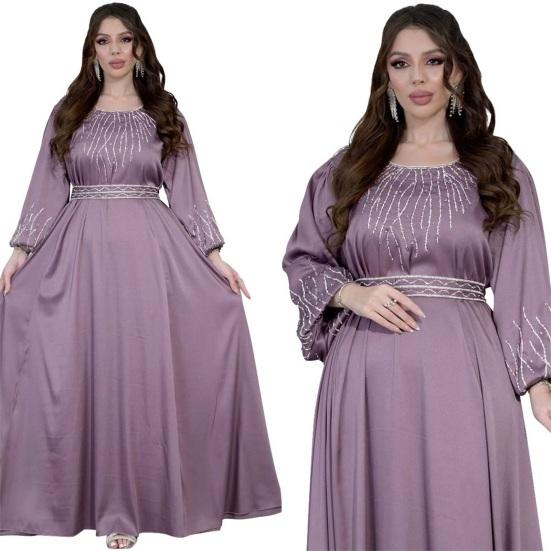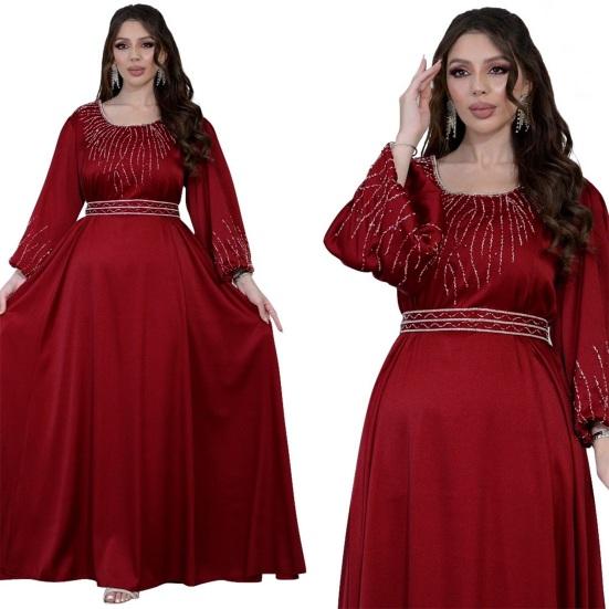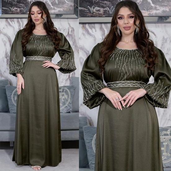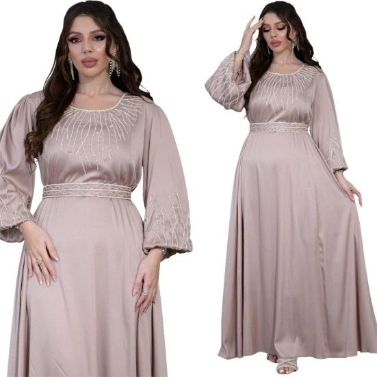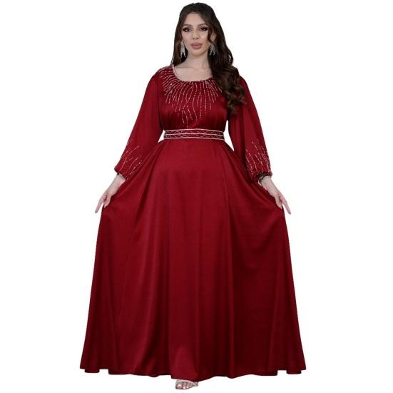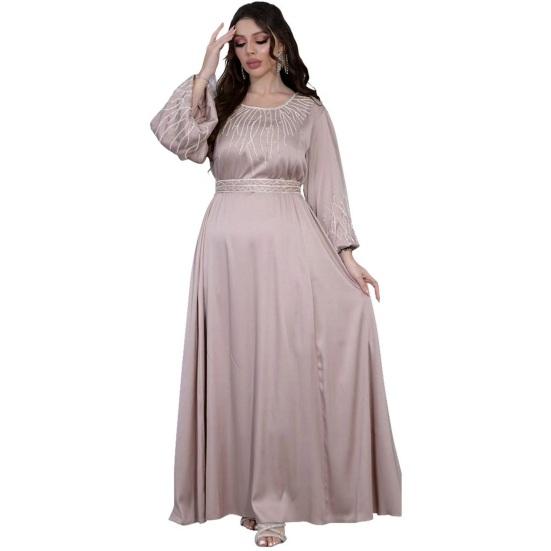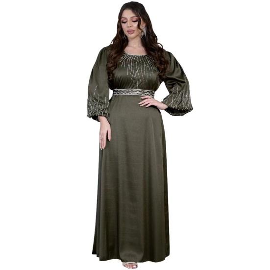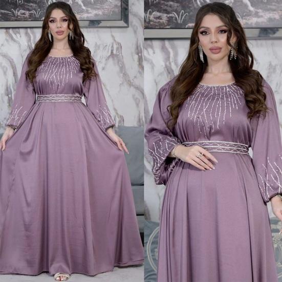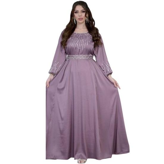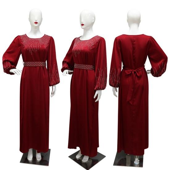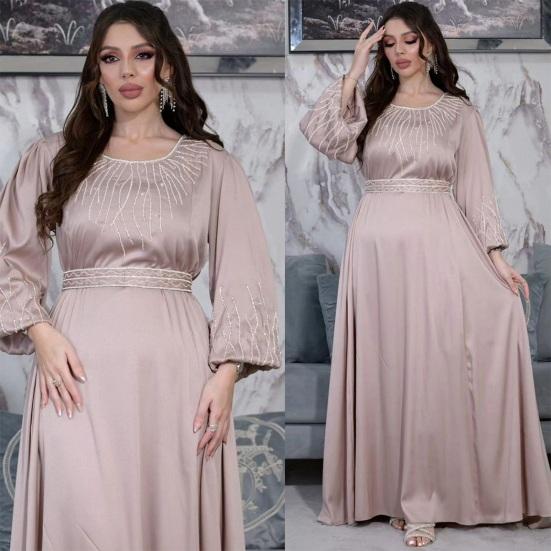 Подчеркните свой стиль с помощью этого шикарного женского платья. Свободный крой и регулируемый пояс обеспечивают комфортный и подчеркивающий фигуру силуэт для всех типов телосложения.. Это платье с круглым вырезом, рукавами-фонариками и потрясающими украшениями из стразов на груди и манжетах излучает элегантность и модный стиль..