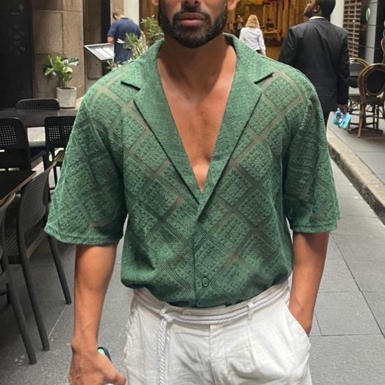 Стильные функции: Придайте непринужденную изысканность этой мужской рубашке в винтажном стиле с лацканами, застежкой на пуговицы и однотонной отделкой, которая создает непринужденный, но стильный образ для любого случая.