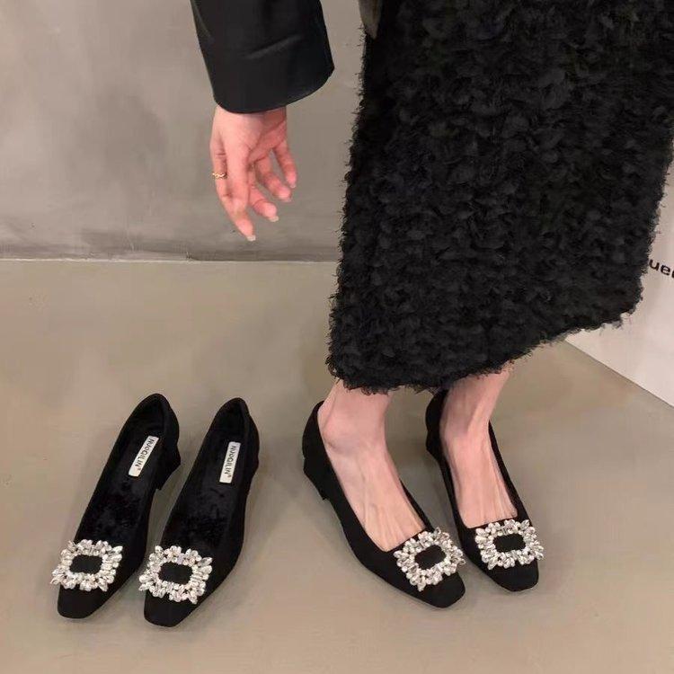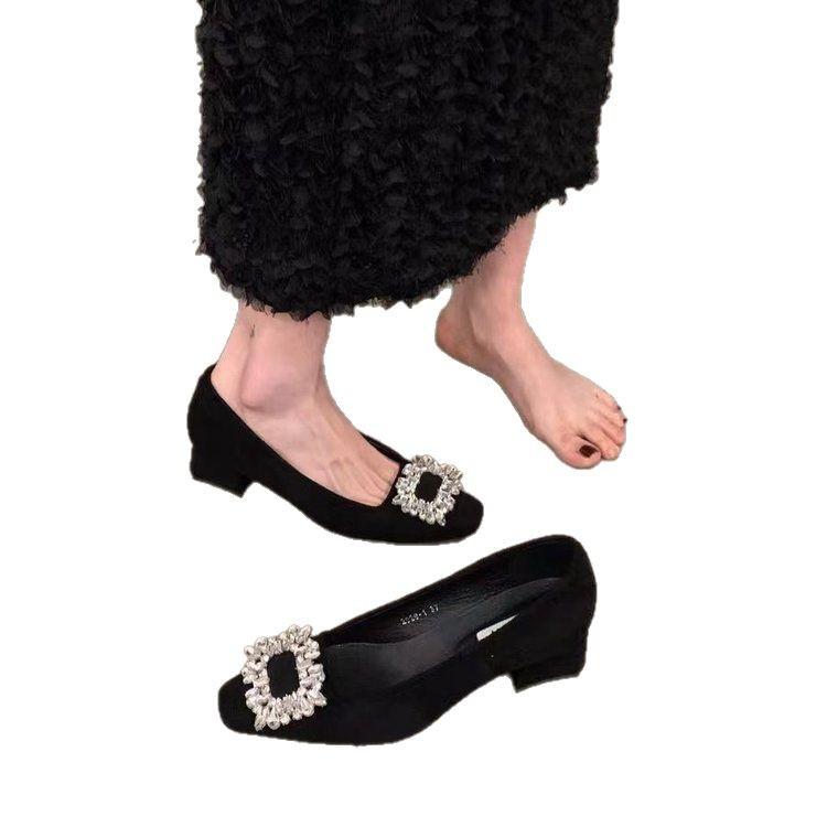 Французские туфли на высоком каблуке женские голова весна 2025 новый корейская версия темперамент универсальные стразы квадратный каблук одинарные туфли женские для работы