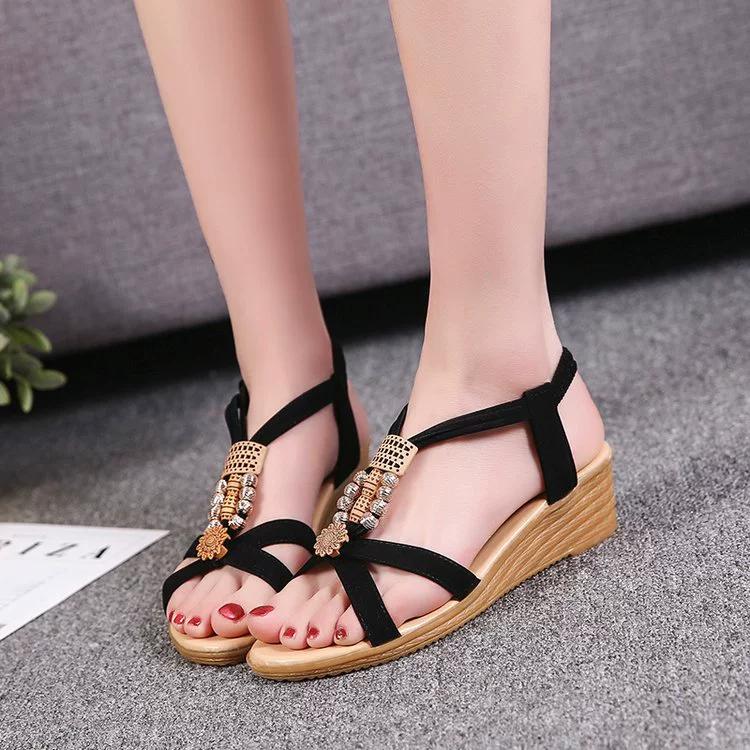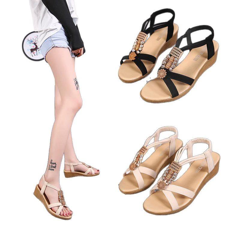Сандалии женские летние корейские версии женских босоножек с открытым носком, украшенных бисером, бохо-танкетные повседневные босоножки Fishbill