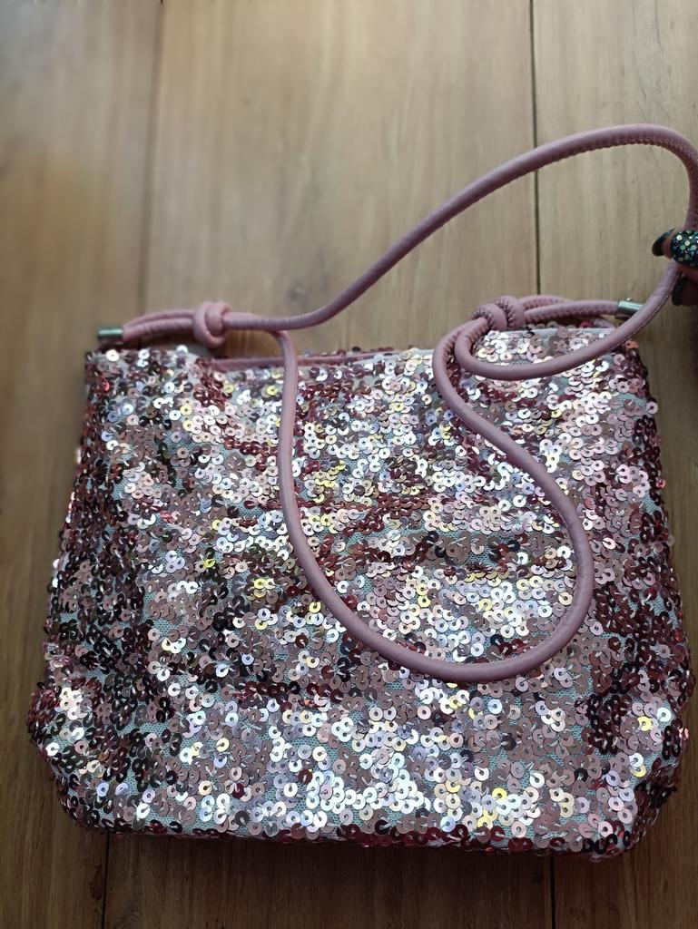 Сумочка с пайетками- то, что нужно летом! Очень порадовало, что ручки оказались в цвет сумки- на фото продавца это не так. Внутри одно отделение. Подкладка черная, хлопковая. Сумочка застёгивается на подмагниченную кнопку. Дочке очень нравится, ходит последнее время только с ней. До этого фаворитом была аналогичная белая сумочка с разноцветными пайетками, тоже с Джума.