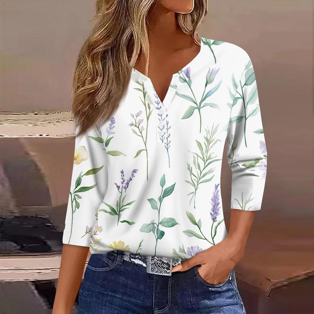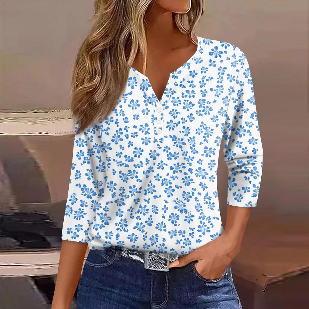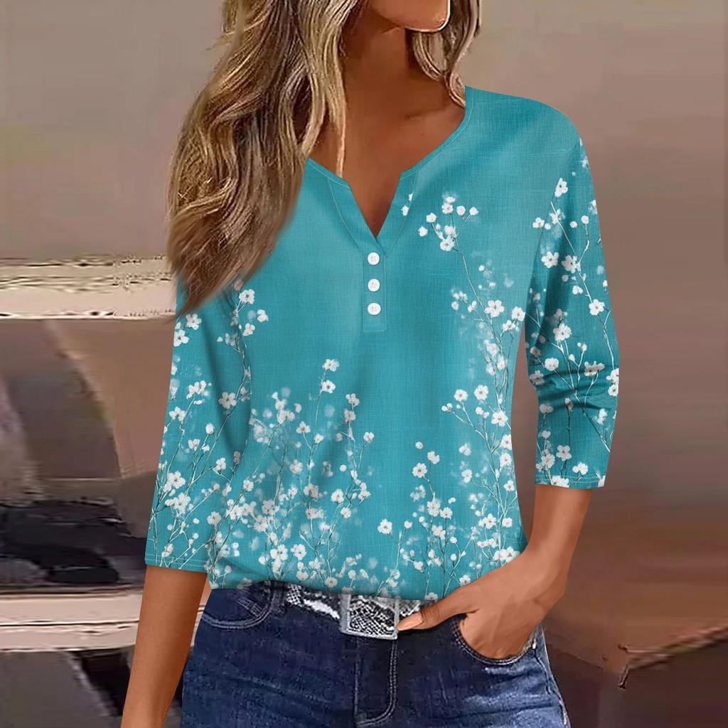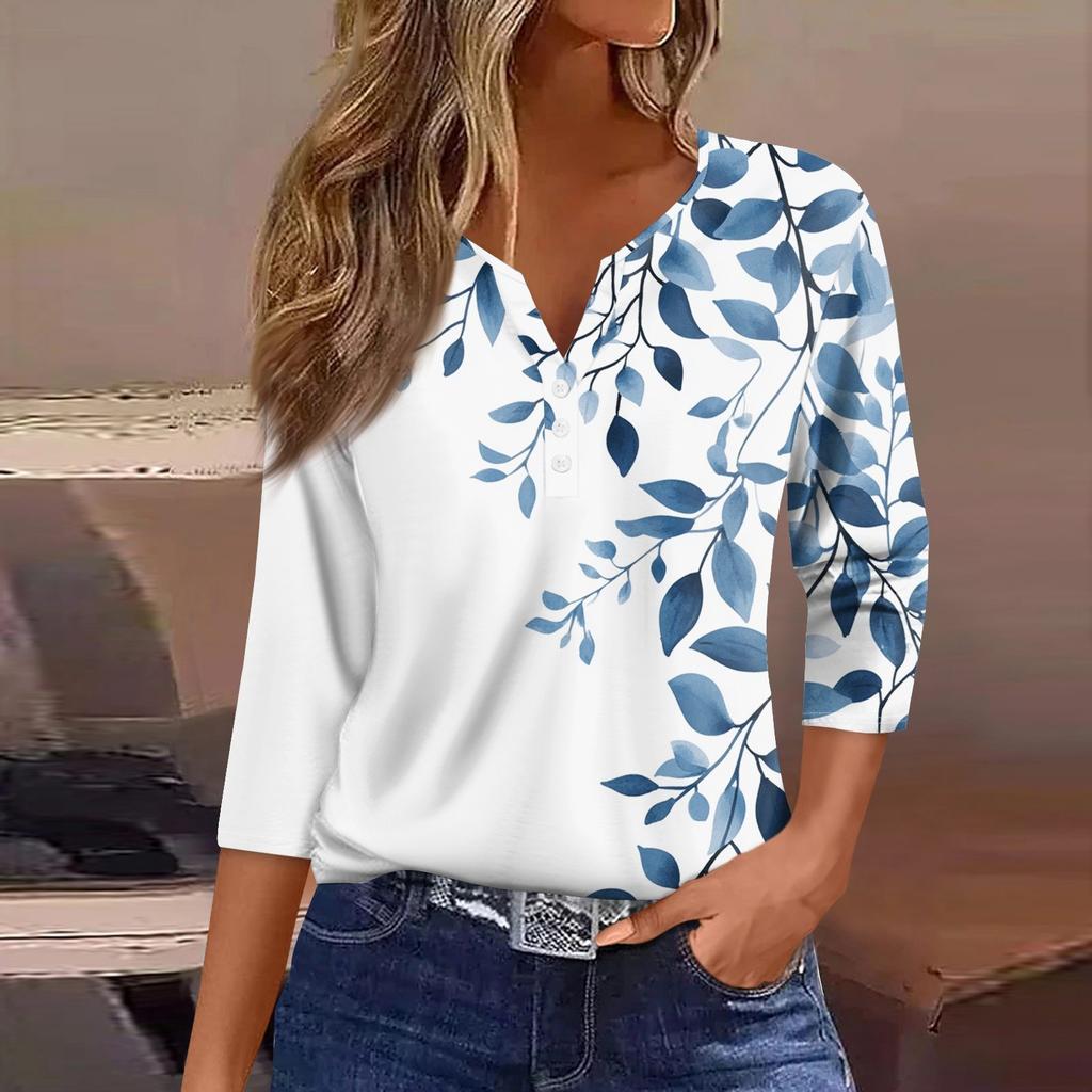 Жен. Футболка Футболка С принтом Пуговицы Рукав 3/4 Повседневные Выходные Мода Классический Классический V-образный вырез Обычный Верх