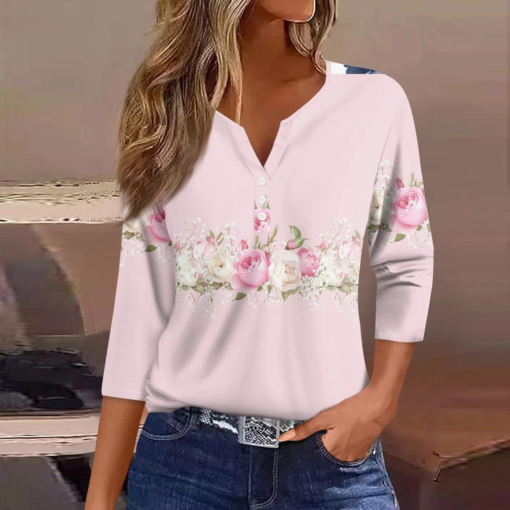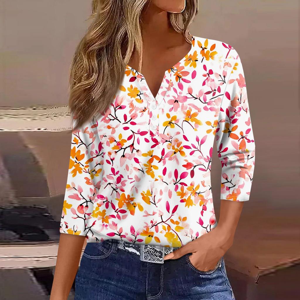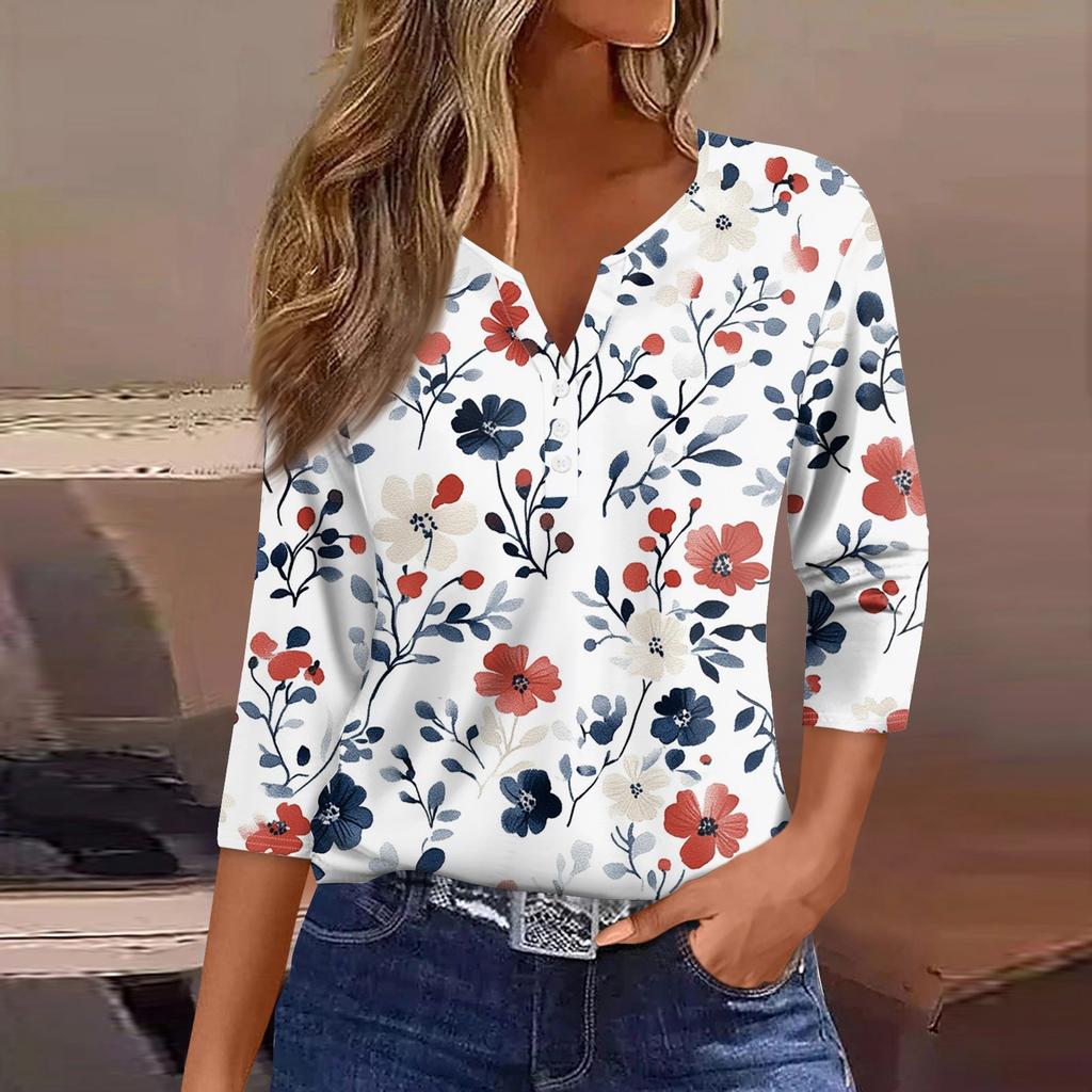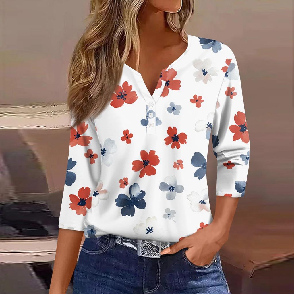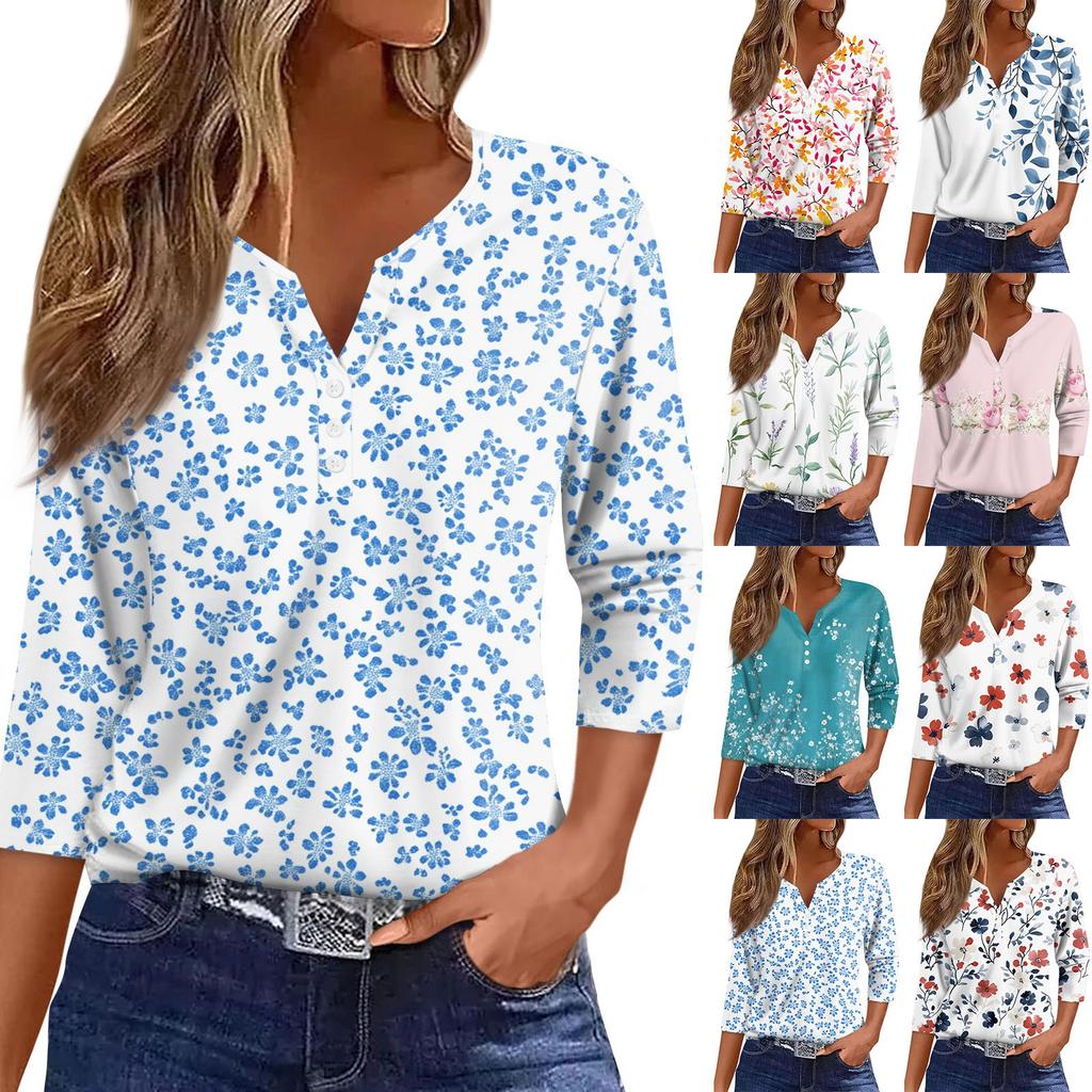 Жен. Футболка Футболка С принтом Пуговицы Рукав 3/4 Повседневные Выходные Мода Классический Классический V-образный вырез Обычный Верх