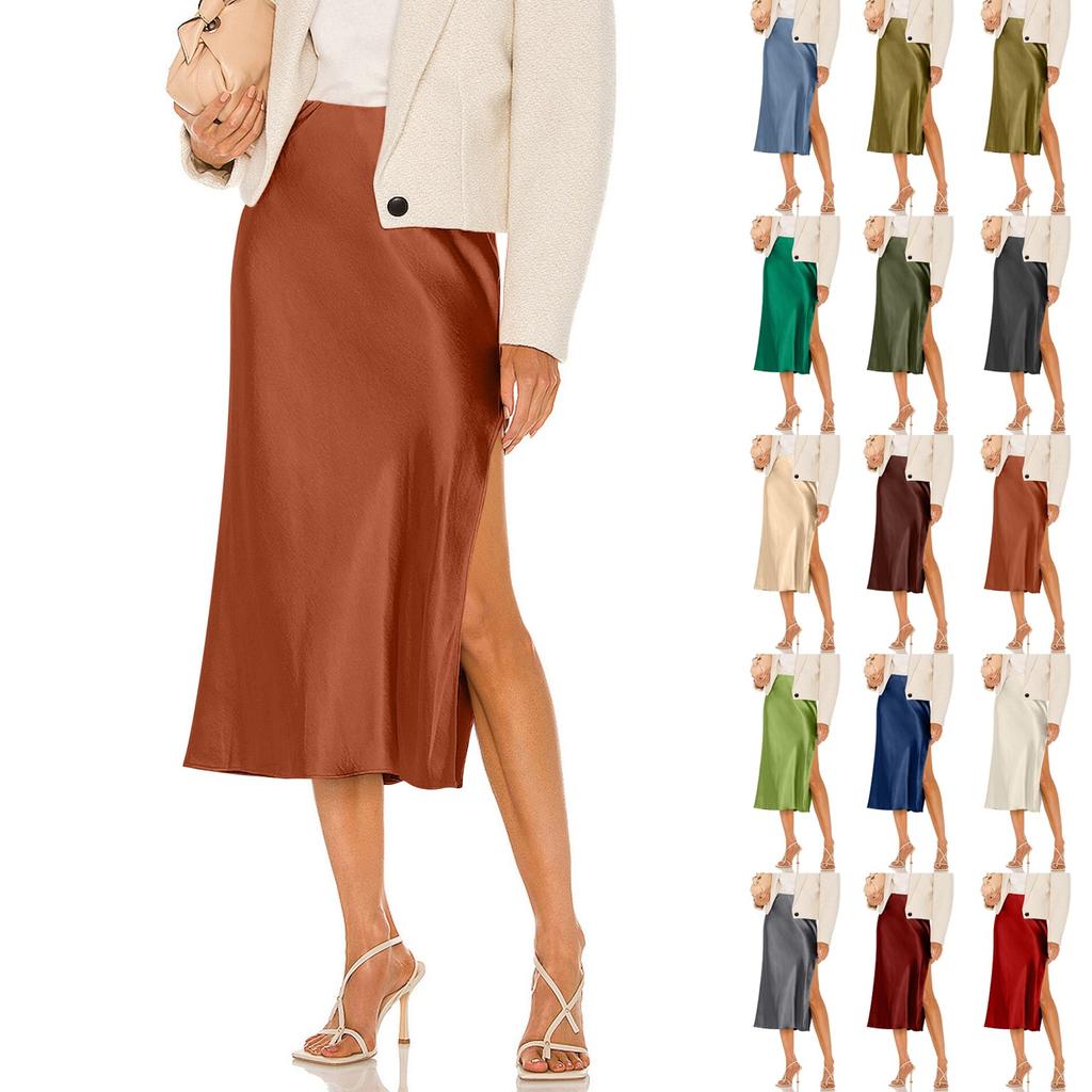 Женская модная однотонная юбка с эластичной высокой талией, однотонная юбка средней длины с разрезом — купить товар онлайн с бесплатной доставкой до всему миру!