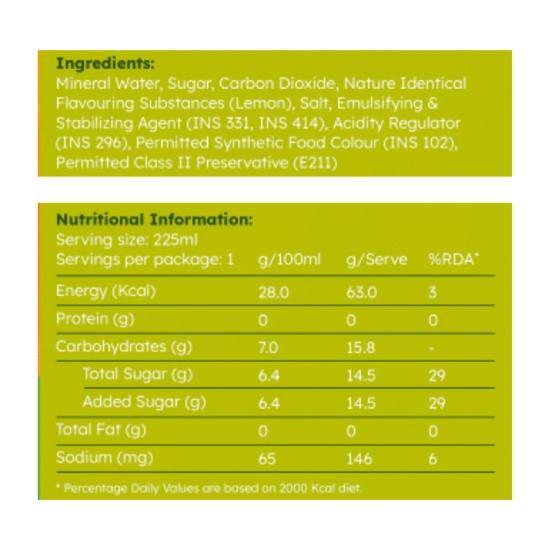 🔹 **Ингредиенты:** Минеральная вода, сахар, углекислый газ, идентичные натуральным ароматизаторы. (Лимон), Соль, эмульгаторы и стабилизаторы (ИНС 331, ИНС 414), Регулятор кислотности (ИНС 296), Разрешенный синтетический пищевой краситель (ИНС 102), Разрешенный консервант класса II (Э211).