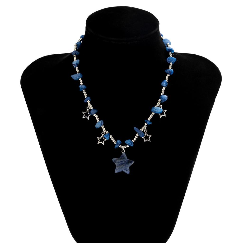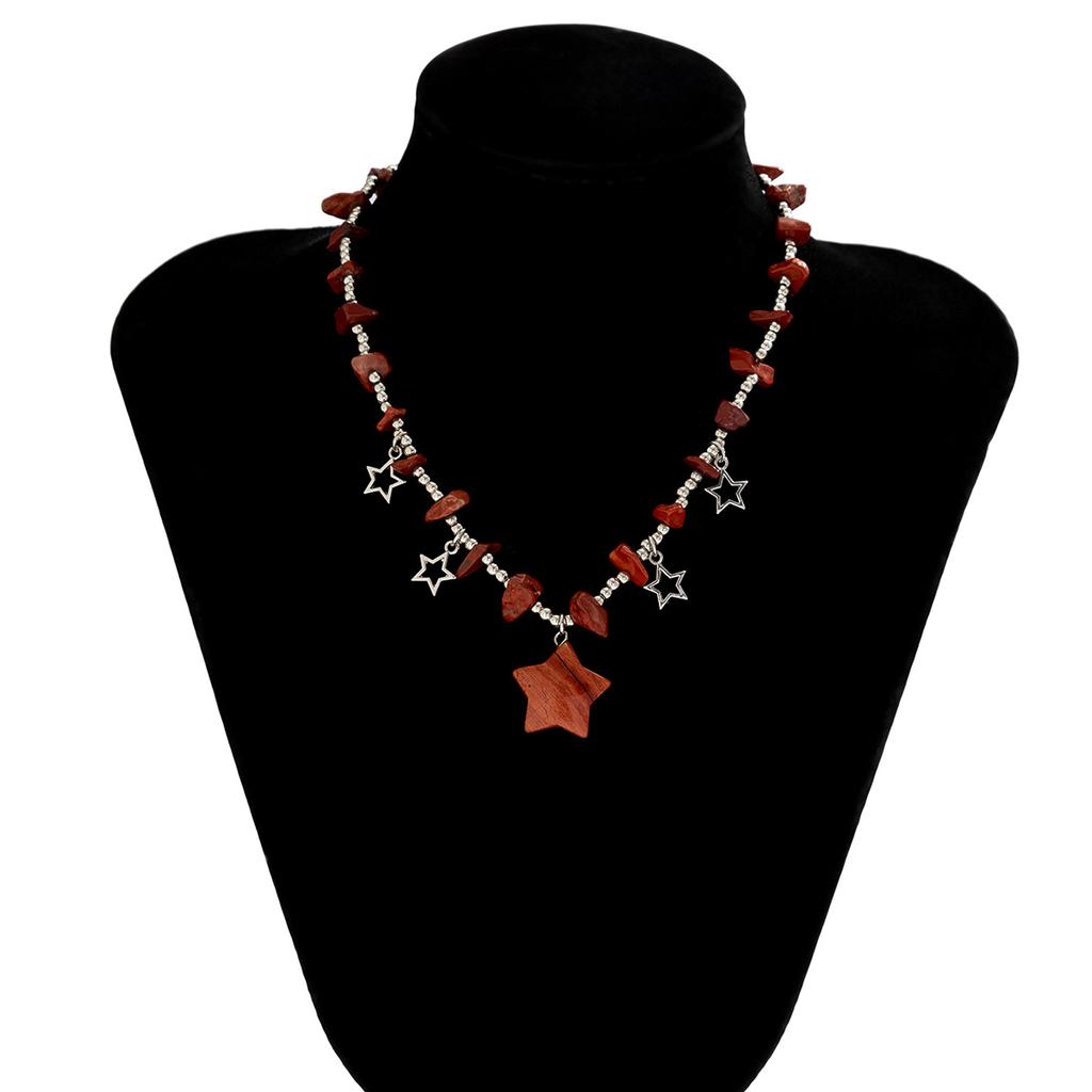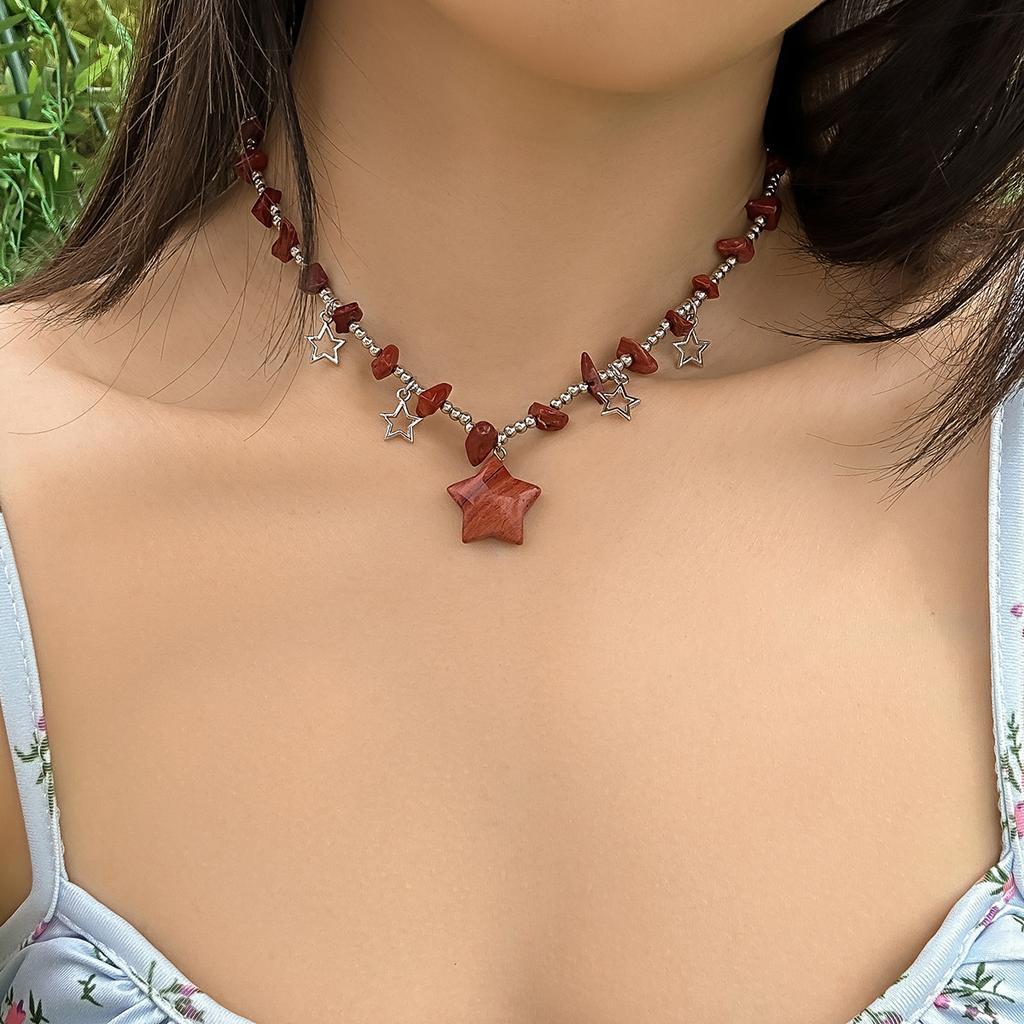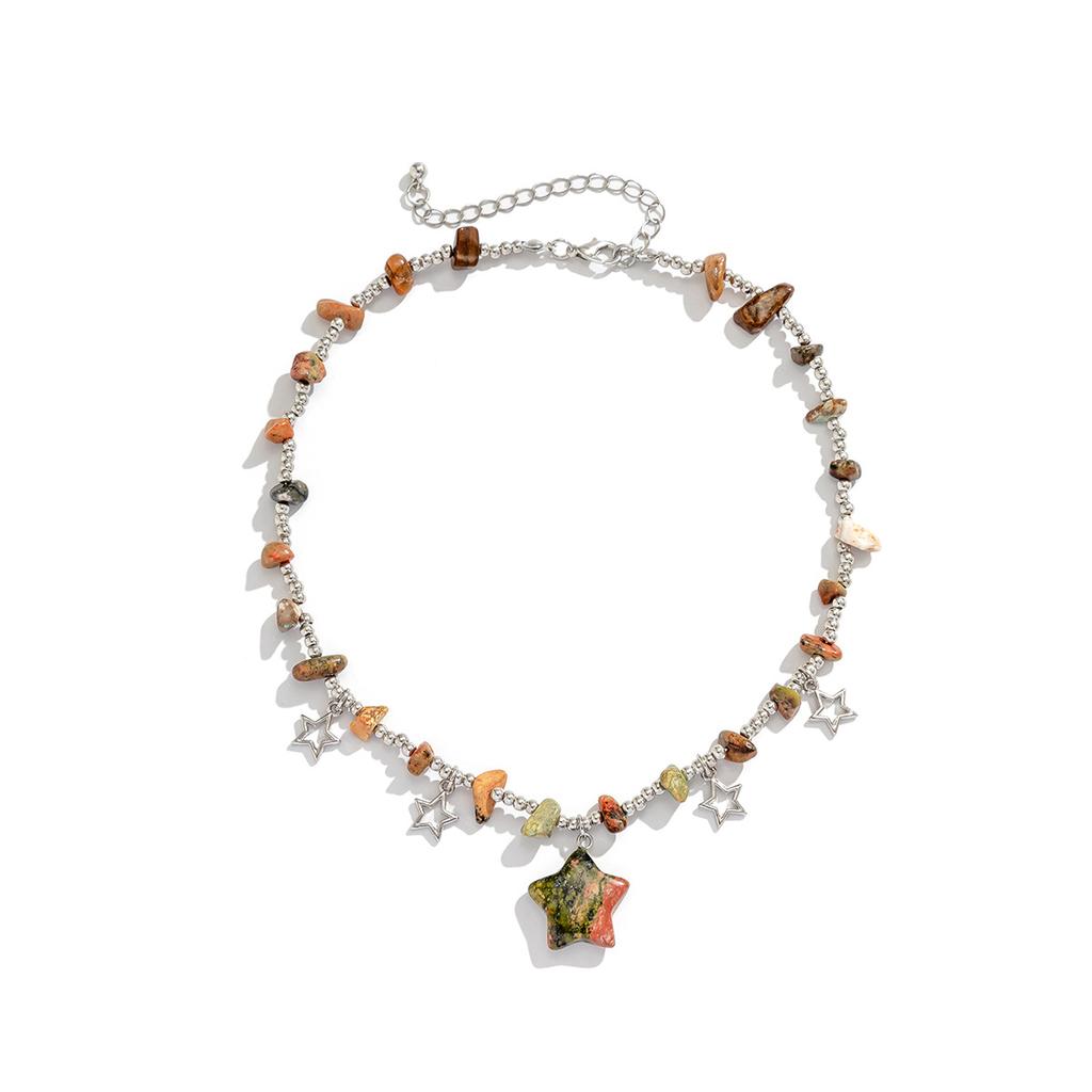 Цветная цепочка на ключицы неправильной формы из гравия и бисера. Универсальное короткое ожерелье со звездой в пасторальном стиле.