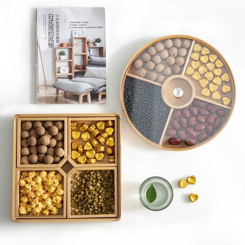 Бамбуковый поднос для хранения орехов, деревянные подносы для сухофруктов, конфет, с крышкой, блюдо для закусок Dim Sum для вечеринок, семейных вечеринок