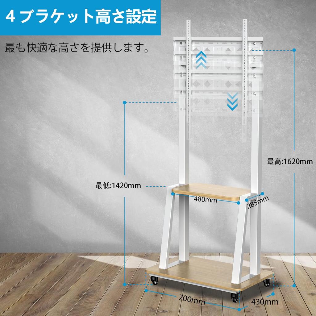 «Регулируемая высота» Высота подставки под телевизор может регулироваться на 3 уровнях от 1420 мм до 1620 мм.. Высота каждой ступеньки 100 мм.. можно отрегулировать высоту телевизора в соответствии с индивидуальным ростом, положением просмотра и даже различными сценами, обеспечивая более комфортные ощущения. Применимо к различным помещениям, таким как дом, офис, конференц-зал, выставка и т. д.