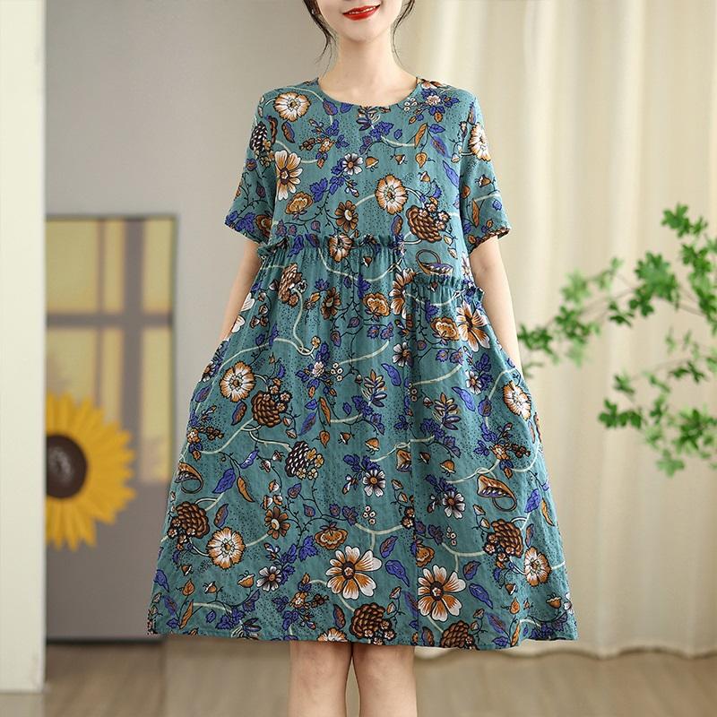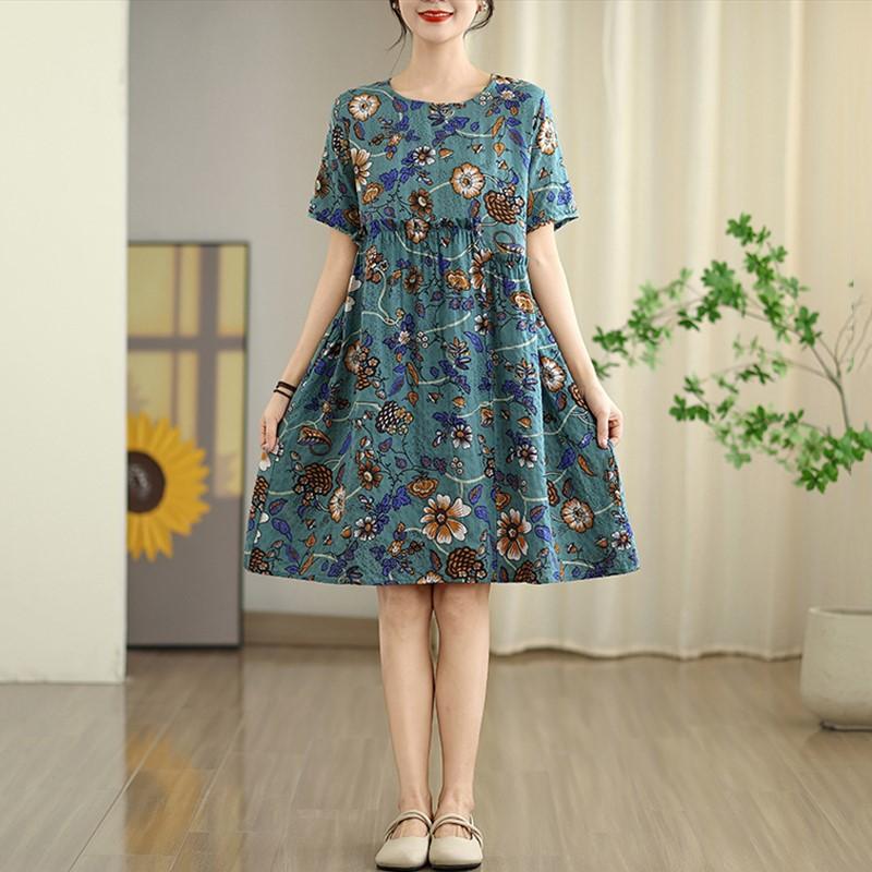 Короткий рукав Плюс размер Хлопок винтажный цветочный новый в платьях для женщин повседневное свободное летнее платье миди