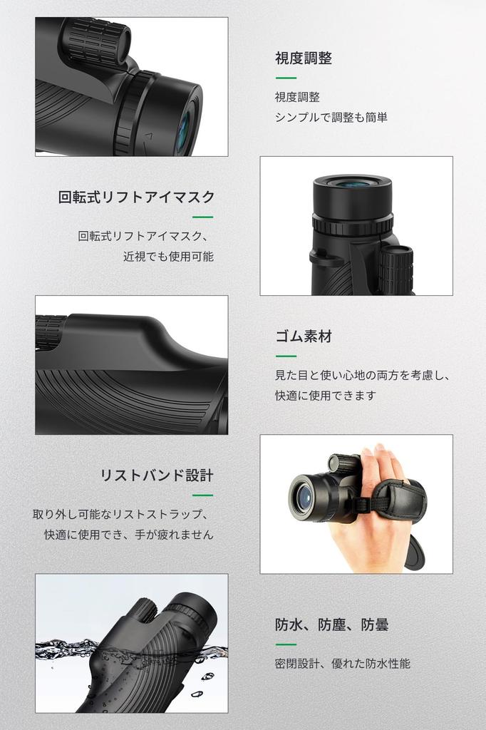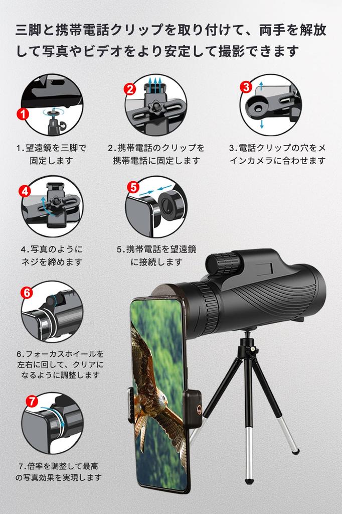 [Монокулярный телескоп 12x50] В комплект монокулярного телескопа SGEBD 12x50 входит:: Монокулярный телескоп 12x50, зажим для мобильного телефона, телескопический штатив, съемный ремешок на запястье, салфетка для протирки линз, сумка для хранения, инструкция на японском языке.