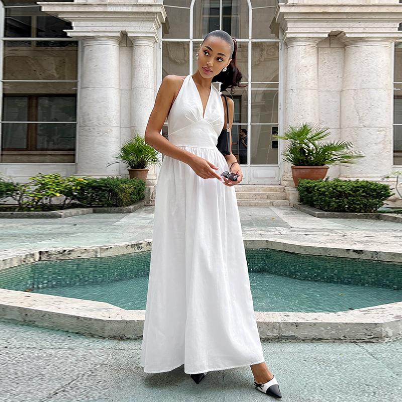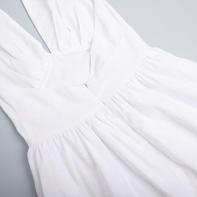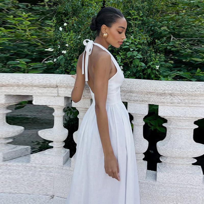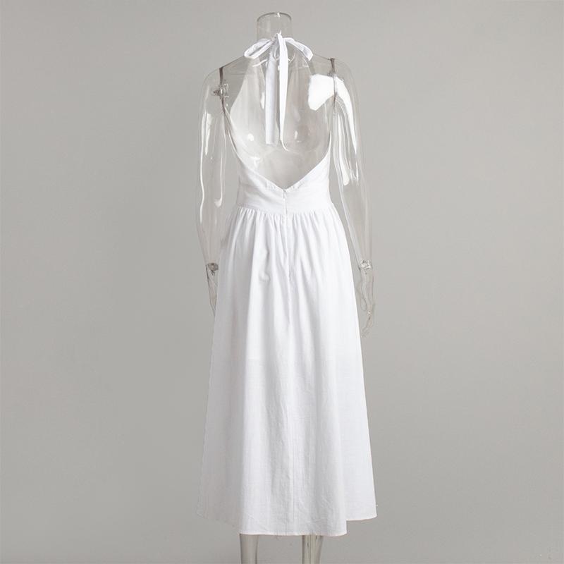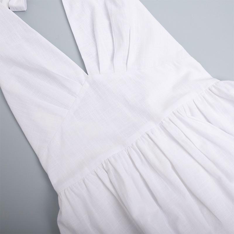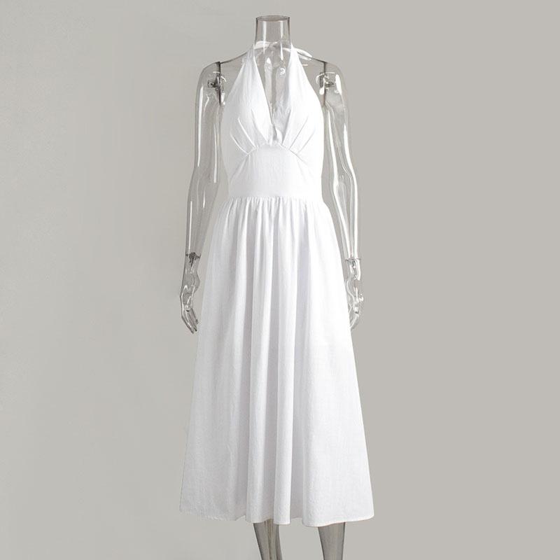 Белое хлопковое платье с V-образным вырезом и бретелькой через шею, сексуальное женское платье А-силуэта со шнуровкой и открытой спиной, с большой юбкой, модное пляжное платье для отдыха, летнее новое
