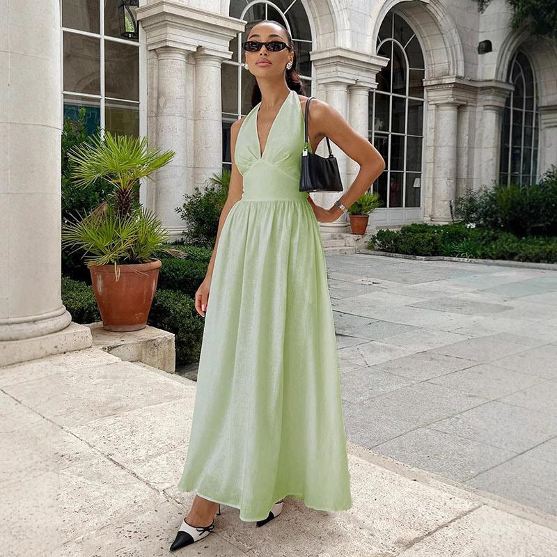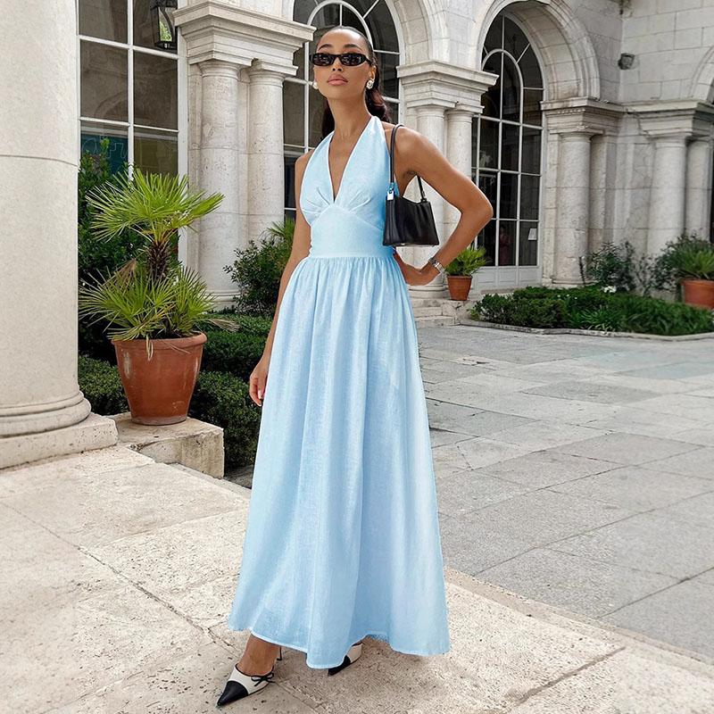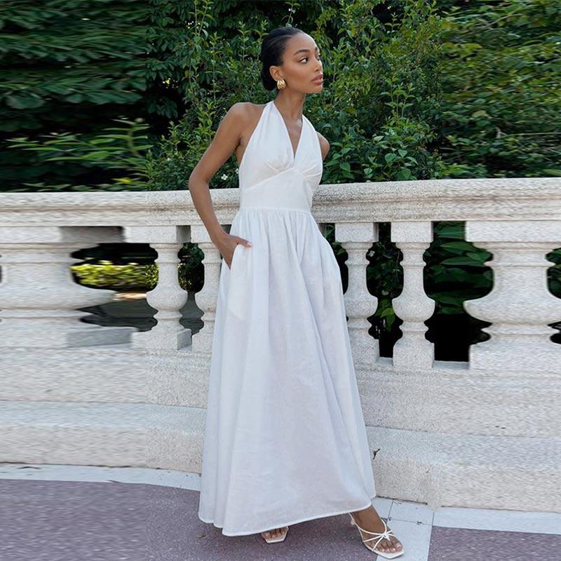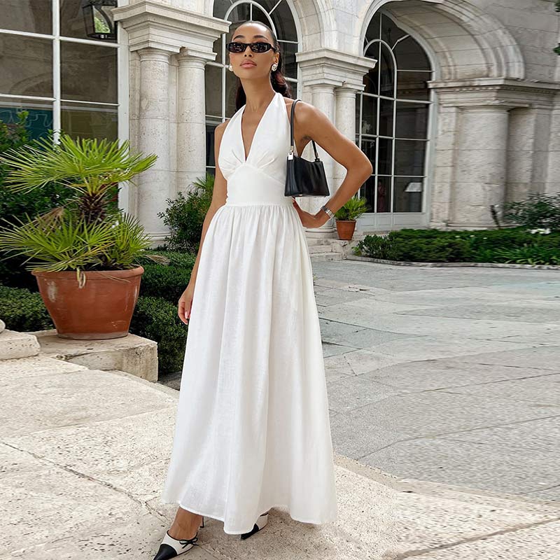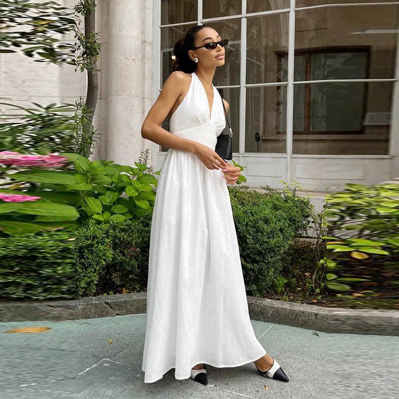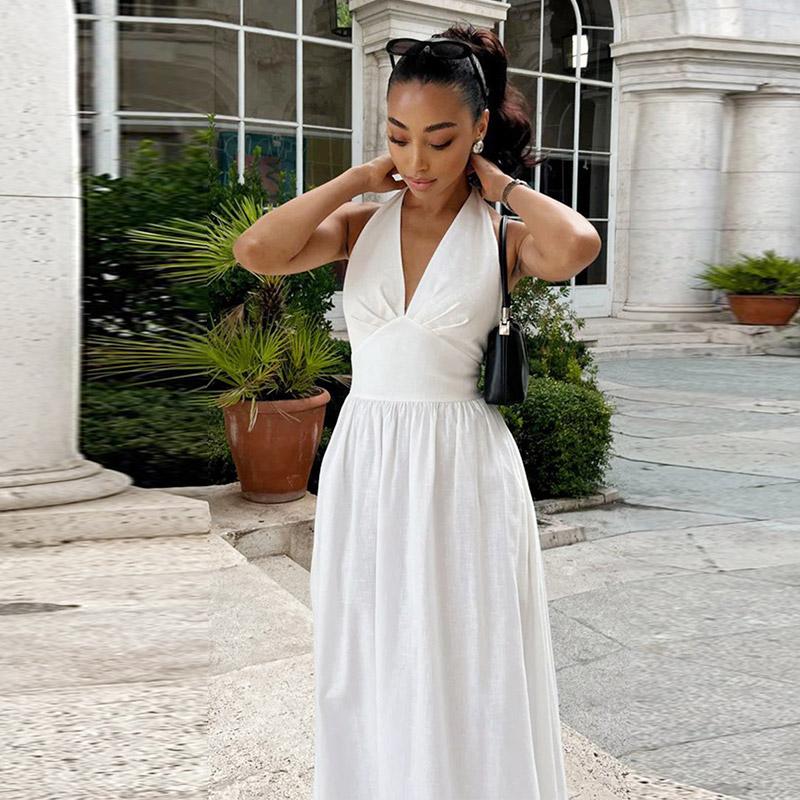 Белое хлопковое платье с V-образным вырезом и бретелькой через шею, сексуальное женское платье А-силуэта со шнуровкой и открытой спиной, с большой юбкой, модное пляжное платье для отдыха, летнее новое