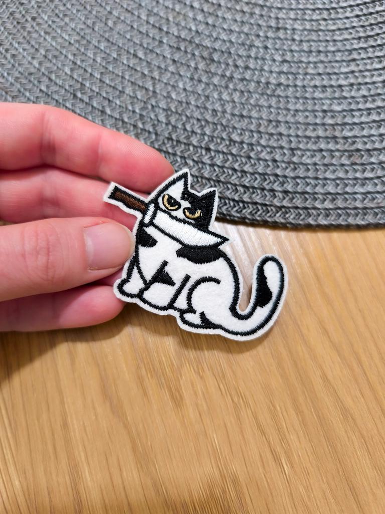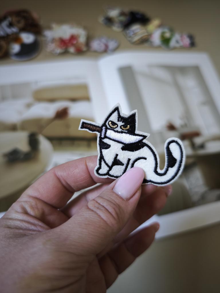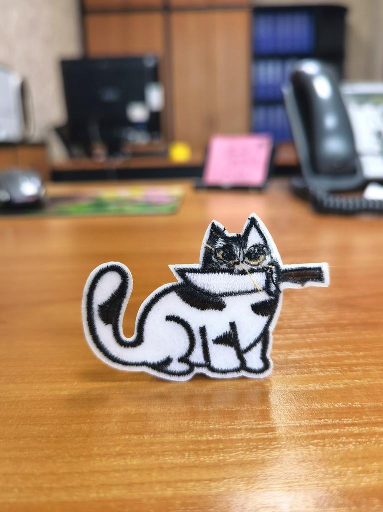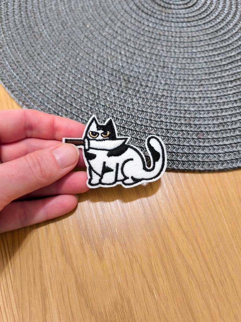 🔸Забавная черно-белая нашивка с котом, который держит в пасти нож. 🔸Идеальна для добавления оригинальности и юмора одежде или аксессуарам. Спасибо продавцу ❤️ и Joom ❤️
