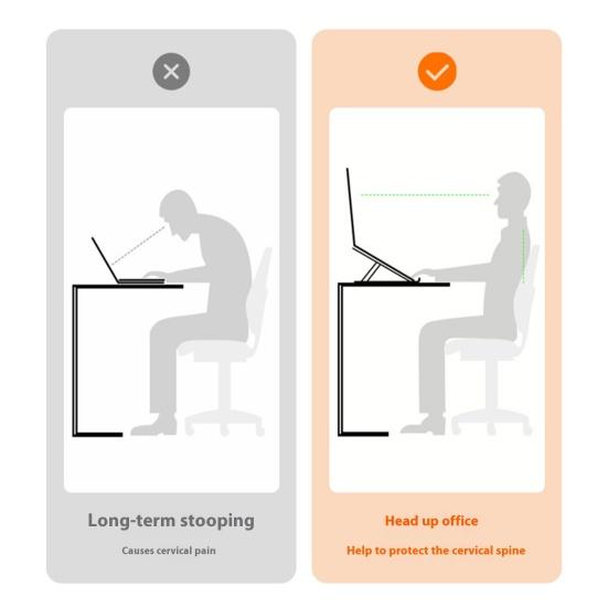 Открытая полая конструкция способствует циркуляции воздуха, предотвращая перегрев и обеспечивая оптимальную производительность.. Благодаря десятиступенчатой регулировке высоты вы можете настроить подставку в соответствии с вашим удобным положением сидя или стоя, снижая нагрузку на шею и плечи.