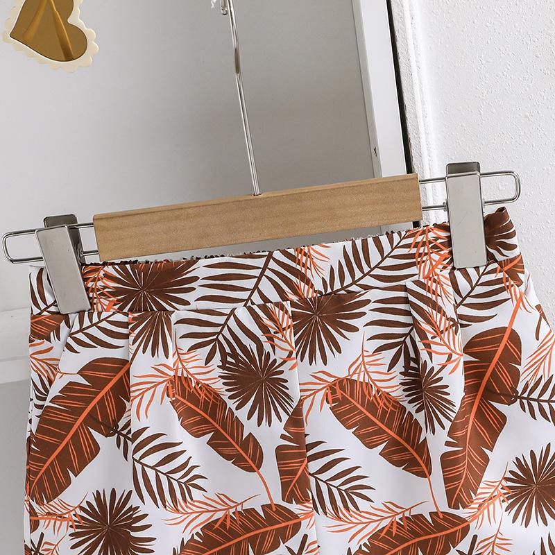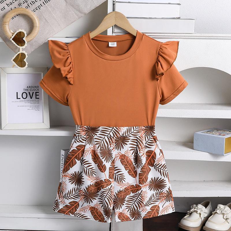 Повседневный костюм для девочек 2025 года, летний детский кружевной топ с короткими рукавами, модные шорты с принтом, комплект из двух предметов