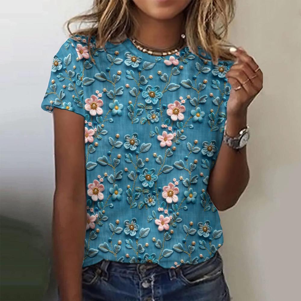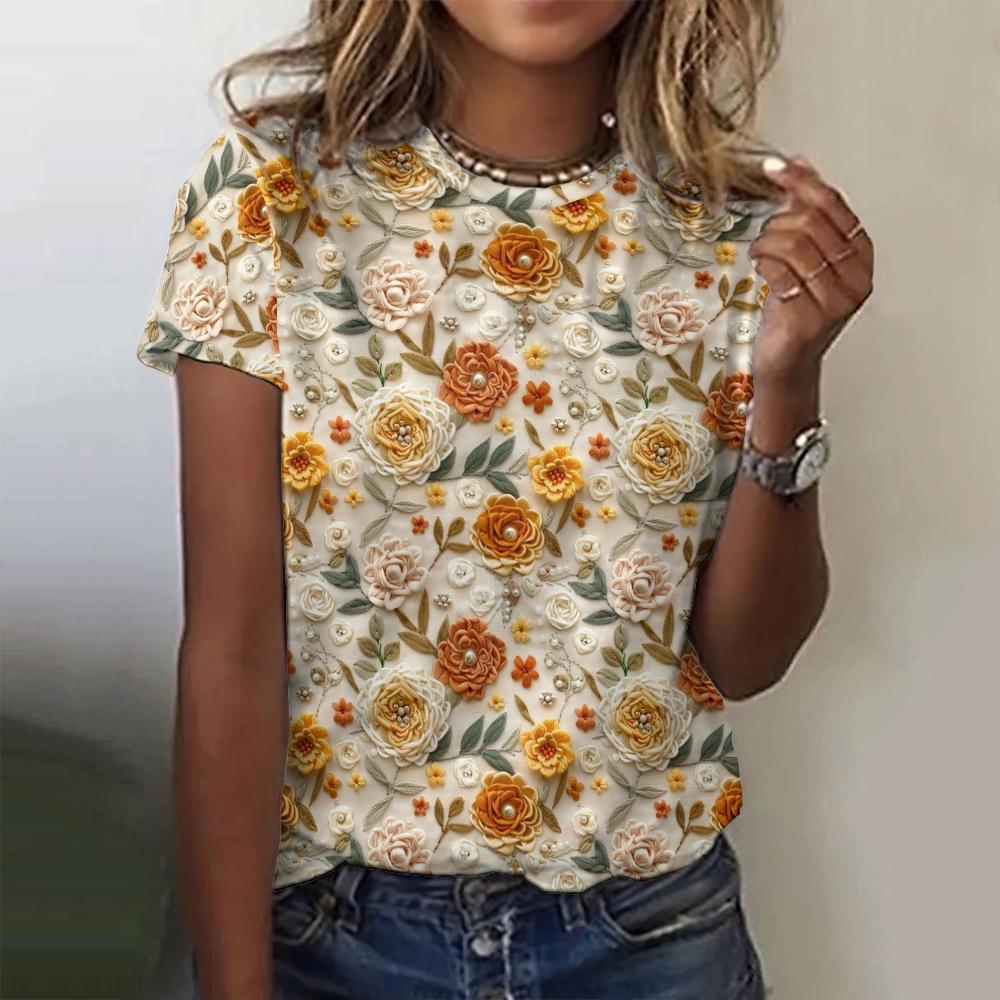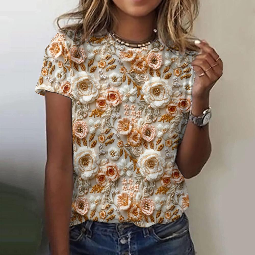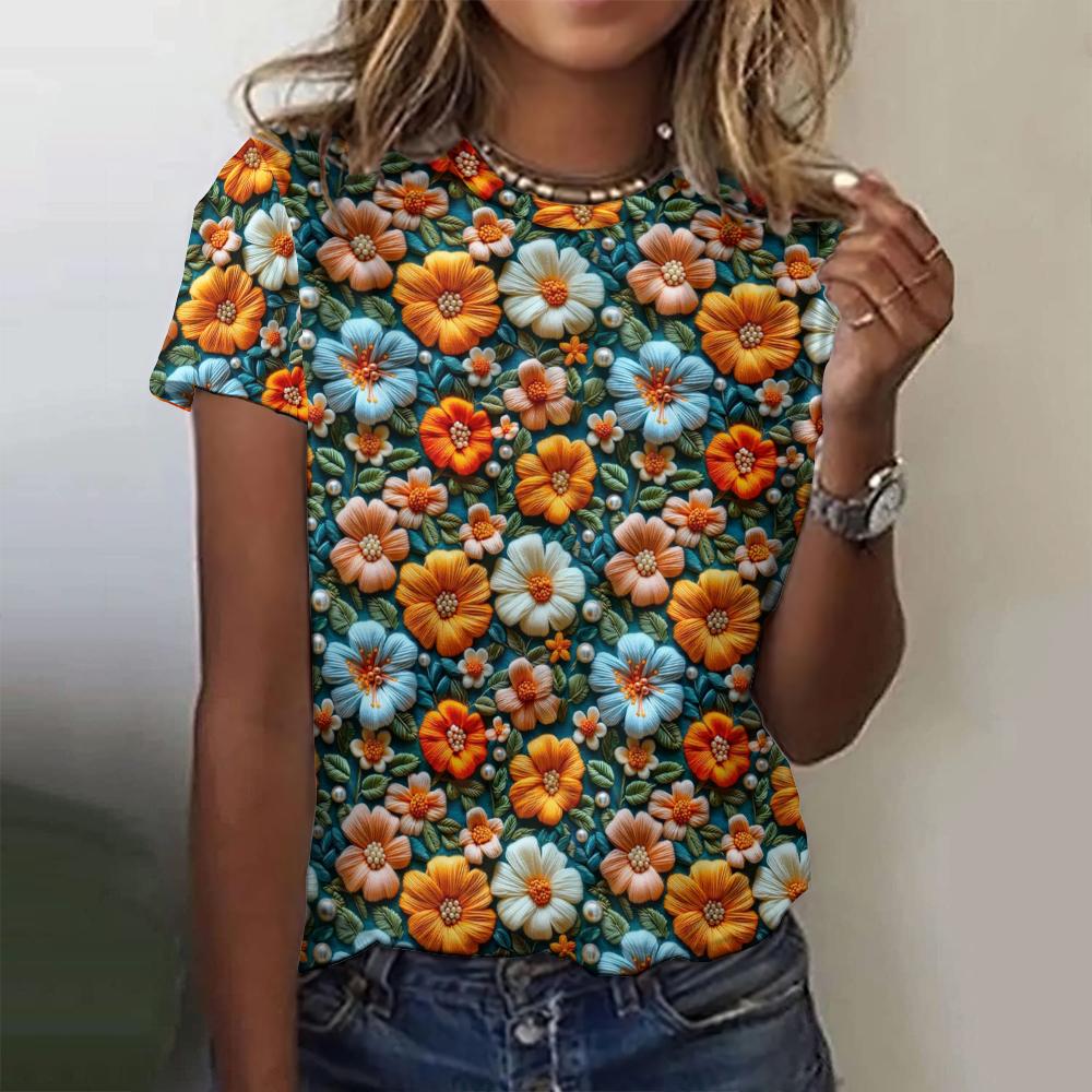 2024 Летние новые женские футболки с 3D-цветочным принтом, модные футболки с короткими рукавами, повседневные свободные топы, трендовая женская одежда, уличная одежда