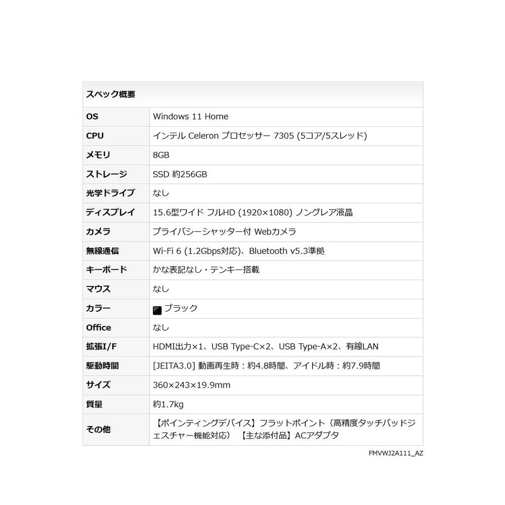Этот ноутбук Fujitsu FMV Lite WA1/J2 — высокопроизводительное устройство, оснащенное Windows 11 Home. Процессор Intel Celeron 7305 (5 ядер/5 потоков/1,10 ГГц) и 8 ГБ памяти (двухканальный совместимый) обеспечить бесперебойную работу. Приблизительно 256 ГБ SSD обеспечивает высокоскоростную обработку данных. 15,6-дюймовый широкоформатный матовый ЖК-дисплей Full HD обеспечивает четкое визуальное восприятие. Он также оснащен новейшими возможностями подключения, такими как совместимость с Wi-Fi 6, совместимость с Bluetooth v5.3, USB3.2 (Ген2) Порт типа C (Совместимость с USB Power Delivery, совместимость с DisplayPort Alt Mode), и выход HDMI. Время работы аккумулятора составляет около 4,8 часов при воспроизведении видео и около 7,9 часов в режиме ожидания. (JEITA 3.0), поэтому его можно использовать в течение длительного времени. Черная расцветка обеспечивает стильный дизайн.