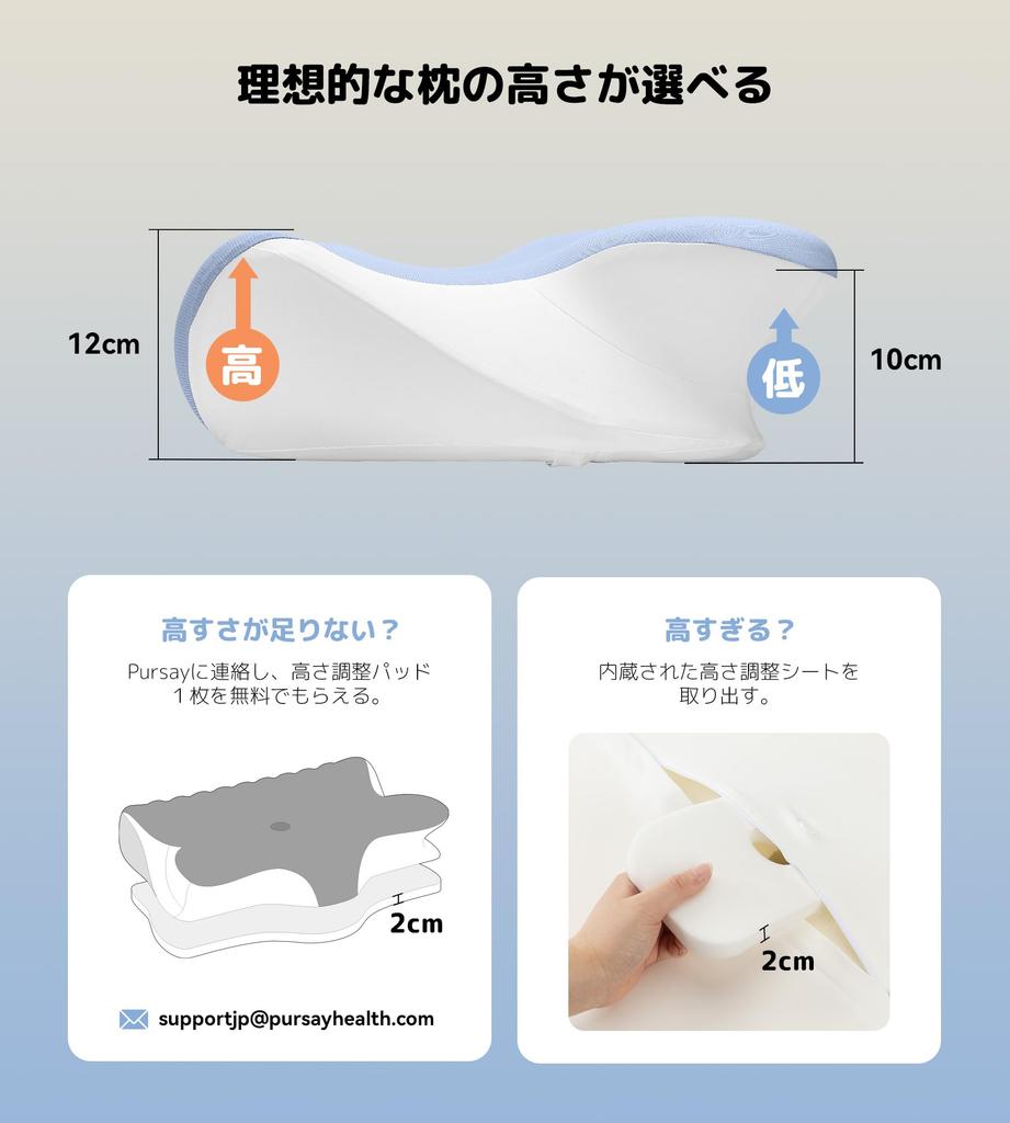 [Выберите предпочтительную высоту] Удобная высота различается в зависимости от человека.. Изменяя переднюю и заднюю часть подушки для сна Pursay, вы можете выбрать между 10 см и 12 см.. Имеется встроенная регулировочная пластина толщиной около 2 см, которую можно вынуть, чтобы сделать ее еще ниже.. Если вам кажется, что подушка недостаточно высокая даже с самой высокой стороны, обратитесь в службу поддержки Pursay, и вы получите бесплатную накладку для регулировки высоты, которая позволит вам увеличить общую высоту подушки примерно на 2 см.. Клиенты могут свободно отрегулировать подушку, установив ее на низкую или высокую высоту в зависимости от своего телосложения, что позволит им комфортно спать на идеальной высоте.