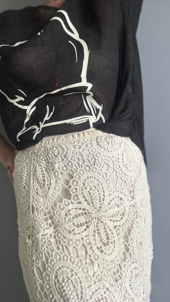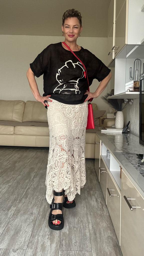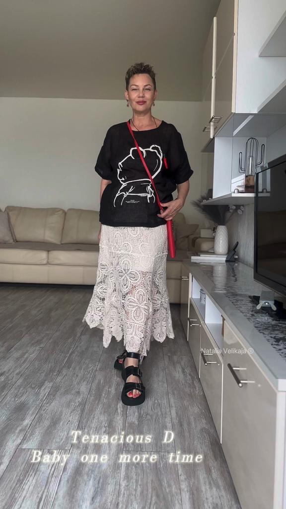 На параметры ОТ 86 и ОБ 111 юбка отлично села, на рост 156 см практически макси. Кремового оттенки, тяжёлая, выглядит красиво, стройнит. Я довольна