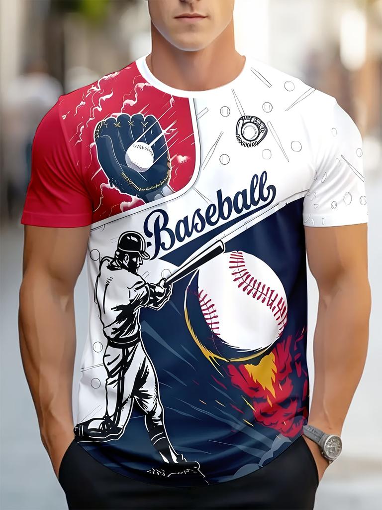 Футболка мужская яркая с 3D-графикой для бейсбола — повседневный полиэстер, эластичный трикотаж, круглый вырез, короткий рукав, стандартный крой