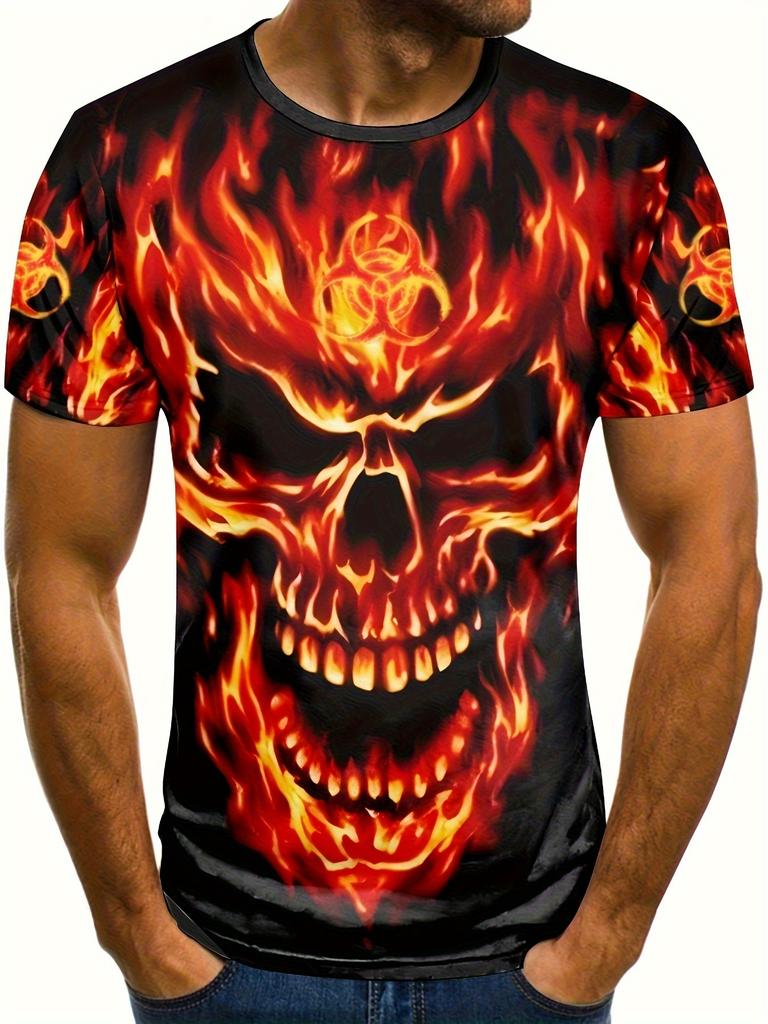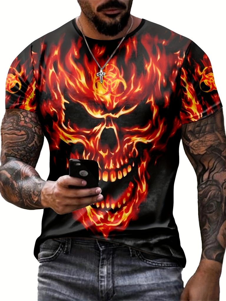 Футболка мужская с 3D-графикой черепа в огне - черная, с коротким рукавом, круглым вырезом и рисунком черепа в огне, мягкая полиэстеровая ткань