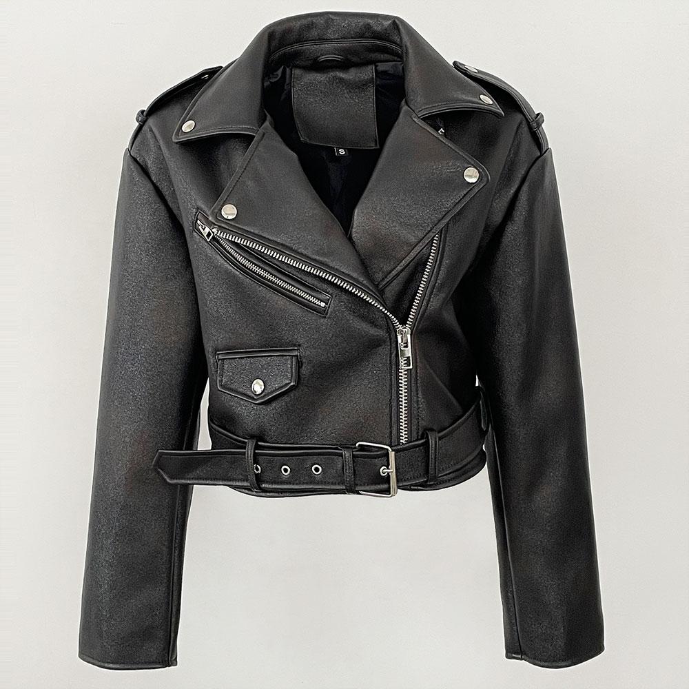 OFTBUY Женская винтажная свободная короткая куртка из искусственной кожи с поясом, мотоциклетная куртка, женская молния, ретро-байкерское пальто, верхняя одежда, топы