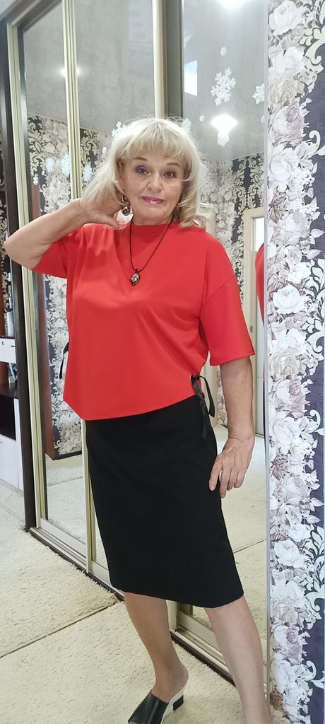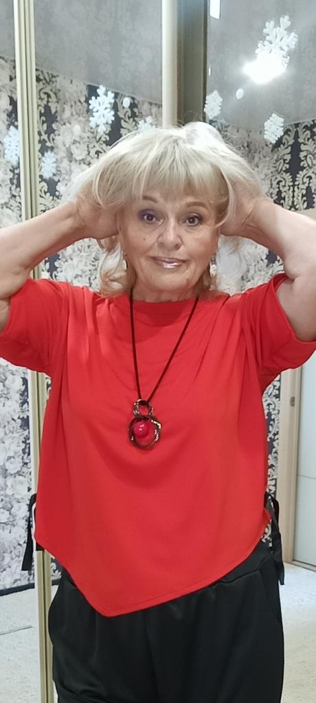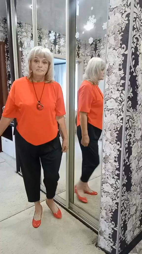 Летний свободный костюм. Прекрасный, подойдёт для повседневной носки. Блузон шикарный, придаёт изюминку фурнитура в виде двух металлических колец в золоте с продетой черной лентой, которую можно заменить в другом цвете и комбинировать с низом. Подол блузки ассиметричный. Брюки - кэррот, широкие в бедрах и заужены к низу. Мне они широкие. С размером не угадала, но думаю и так пойдет, буду носить. Длина на мой рост 164см. почти по щиколотку. Ткань синтетика, верх чуть поплотнее, а низ потоньше. Мои параметры: 106-90-106см. Рекомендую.