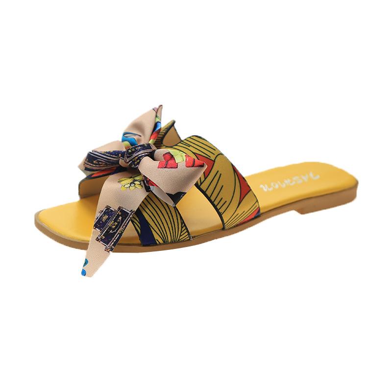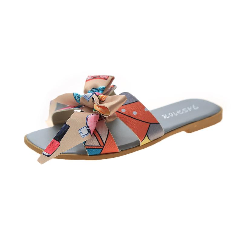 Тапочки с цветной лентой и бантом на плоской подошве, женские, лето 2025, новая верхняя одежда, универсальная, с цветочным принтом и одним словом