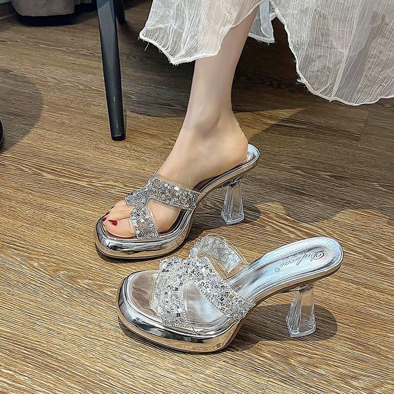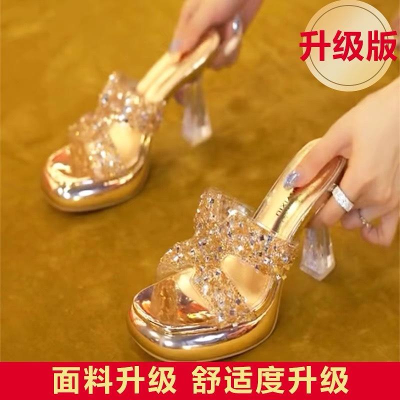 Крутые тапочки с открытым носком и толстым каблуком, однотонные тапочки со стразами, женские летние новые 2024 года водонепроницаемые тапочки с толстым дном и высоким каблуком