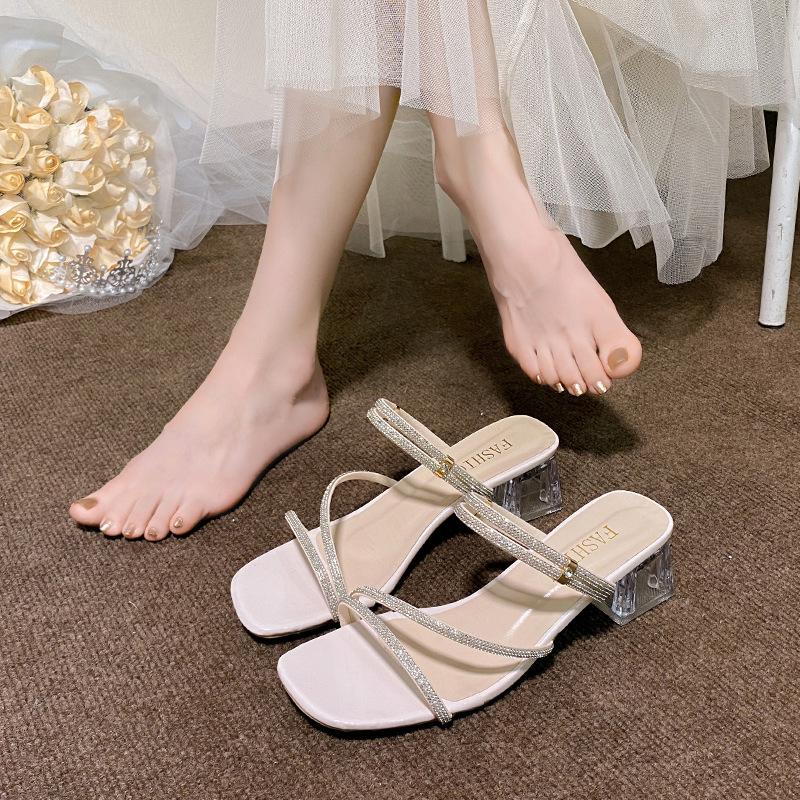 Французские тапочки на толстом каблуке со стразами, женская обувь, новинка 2024 года, летний темперамент, тапочки