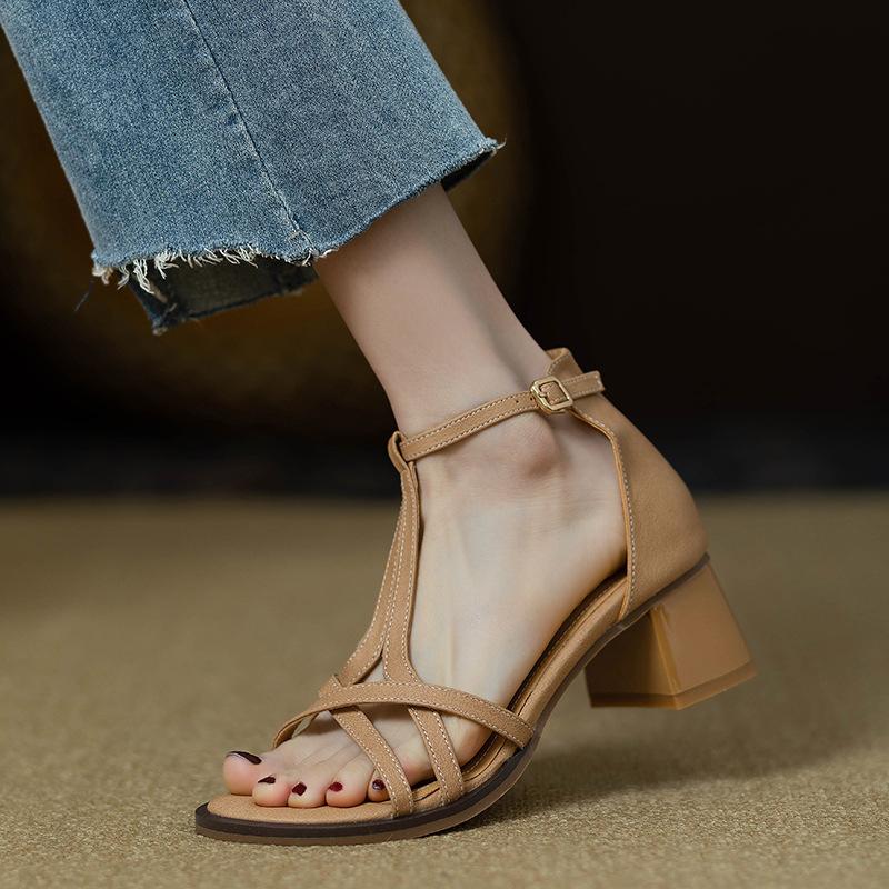 Босоножки женские с круглым носком и толстым каблуком, открытые, летние, 2024, черные, средний каблук, римские туфли на высоком каблуке