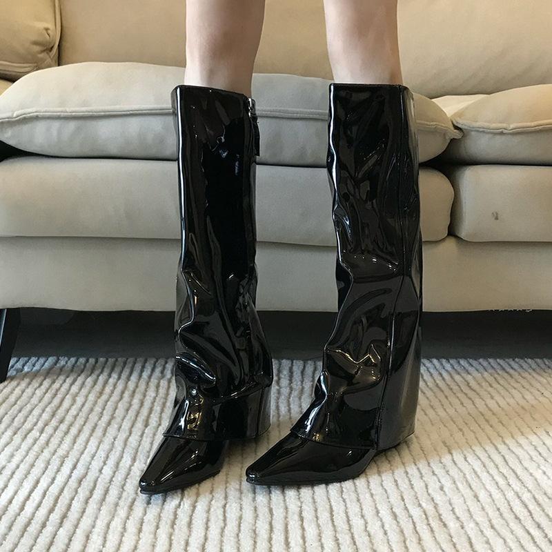 Европейский и американский стиль Spice Girls! Сапоги Женские сапоги Высокие сапоги, но до колена Узкие черные лакированные кожаные брюки с острым каблуком-танкеткой Сапоги