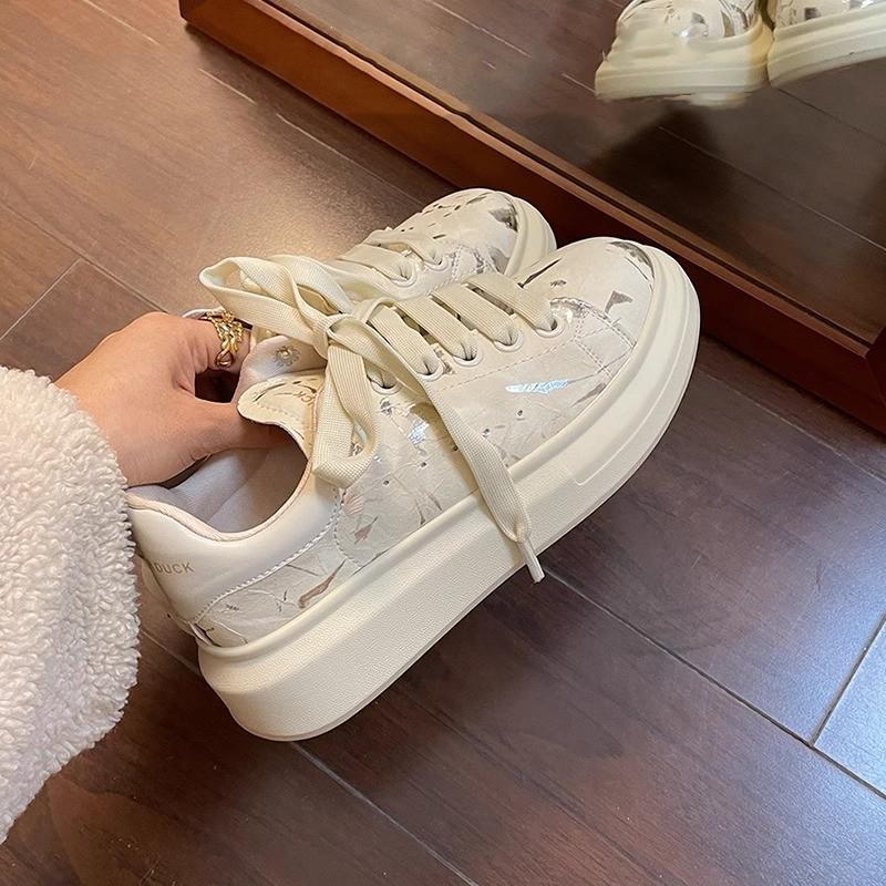 Gu Yunshu Блестящие повседневные туфли на толстой подошве, увеличивающие рост, белые туфли, женская повседневная обувь, весна 2024, новые спортивные туфли на шнуровке для женщин