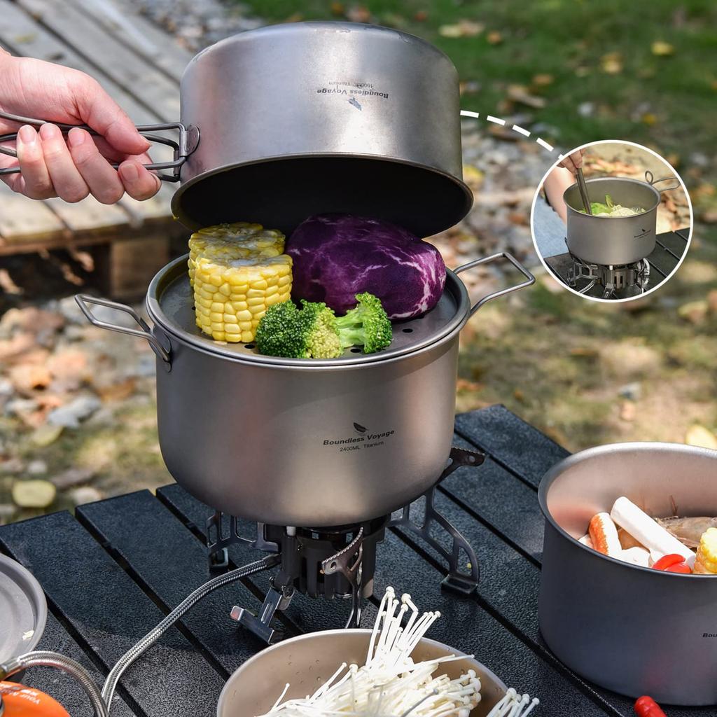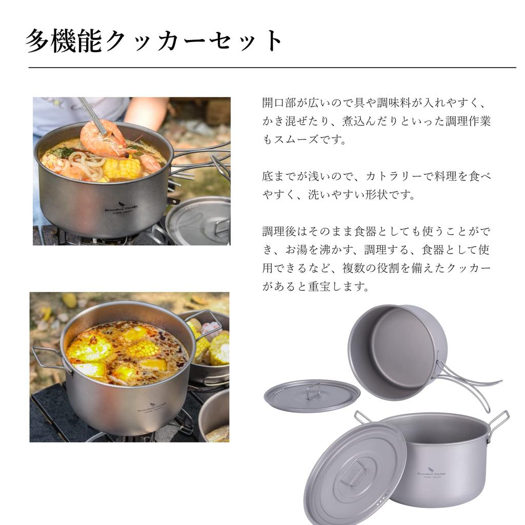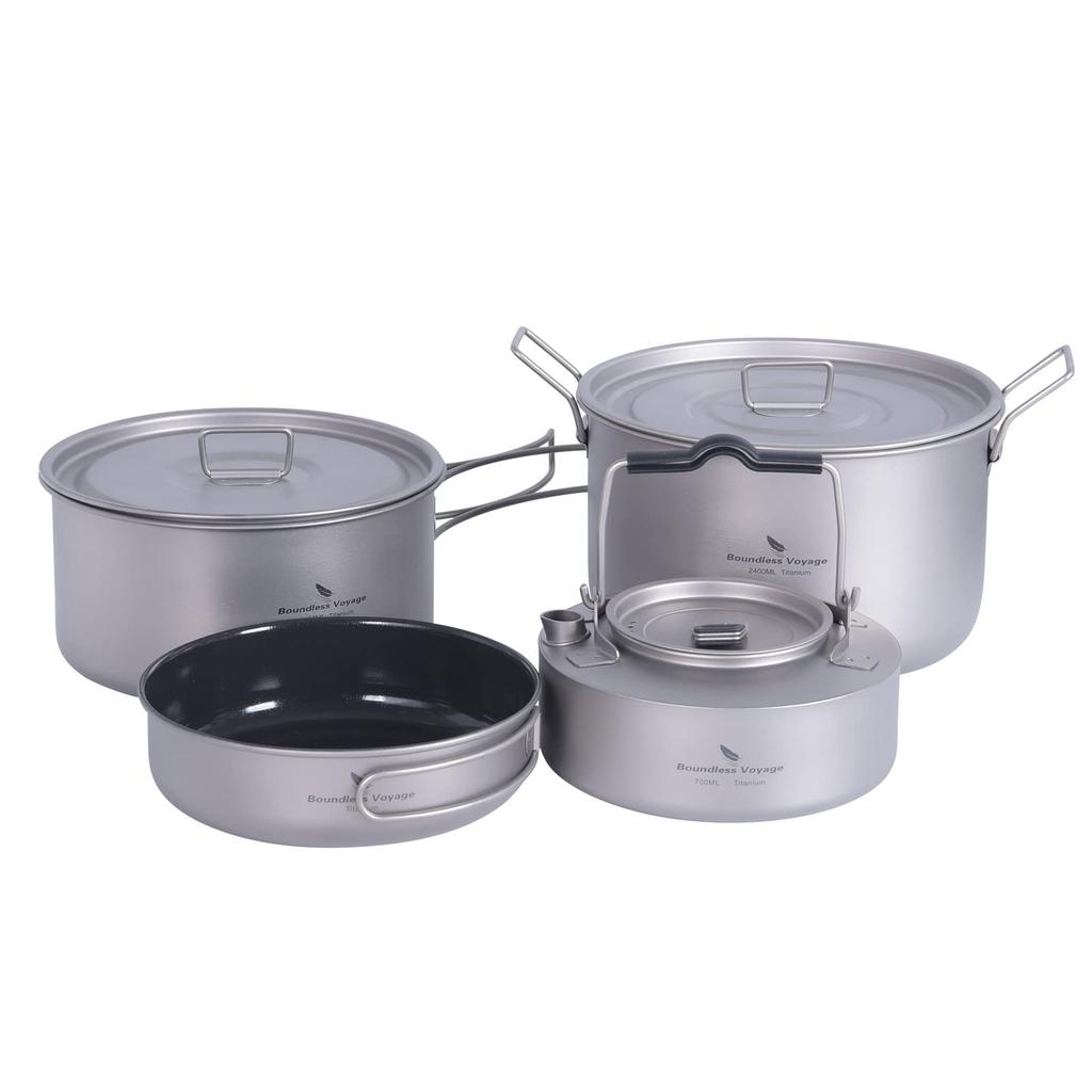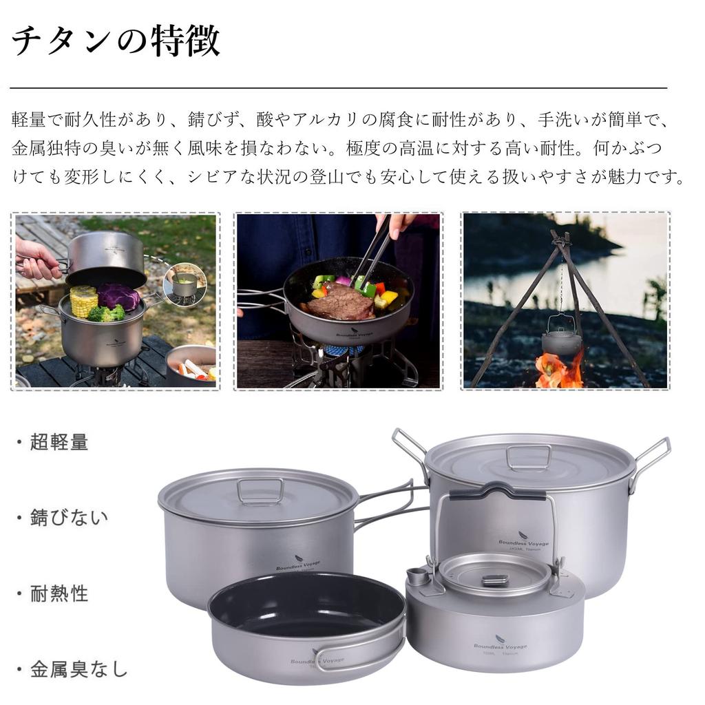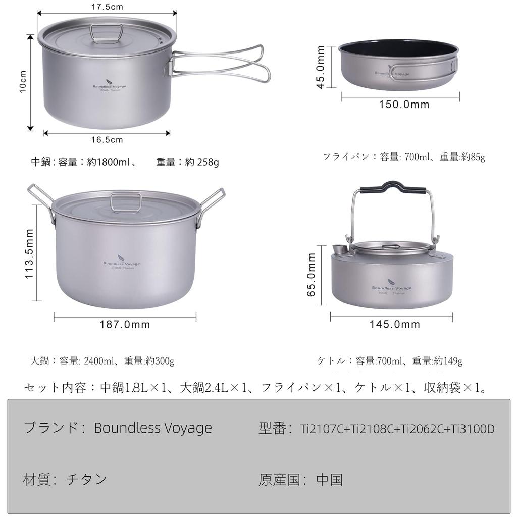 [Подробности о продукте] Материал: 99,8% титан; Общий вес: приблизительно. 511г; Средняя кастрюля 1600мл, 272г; Большая кастрюля 2400мл, 300г; Сковорода 700мл, 85г; Чайник 700 мл, 149 г [Содержимое набора] Средняя кастрюля x 1, большая кастрюля x 1, сковорода x 1, чайник x 1, сумка для хранения x 1.