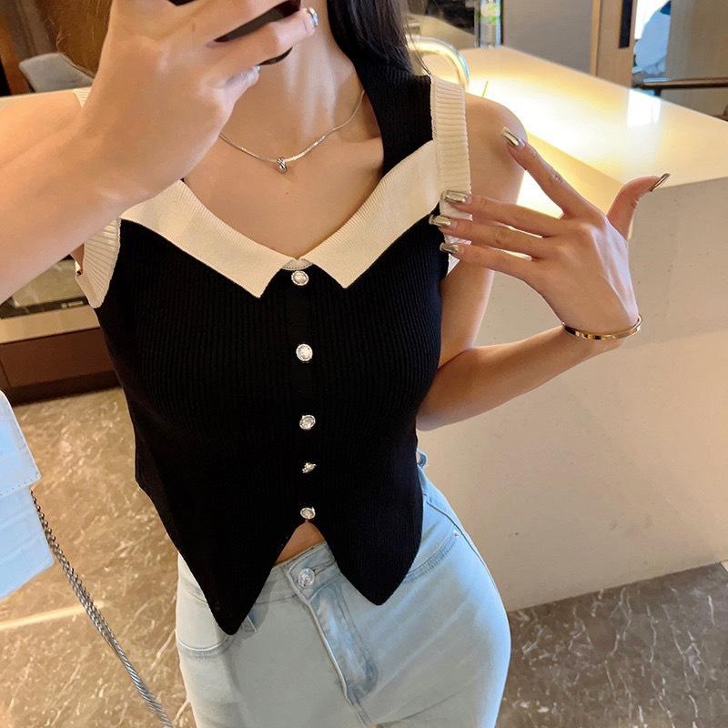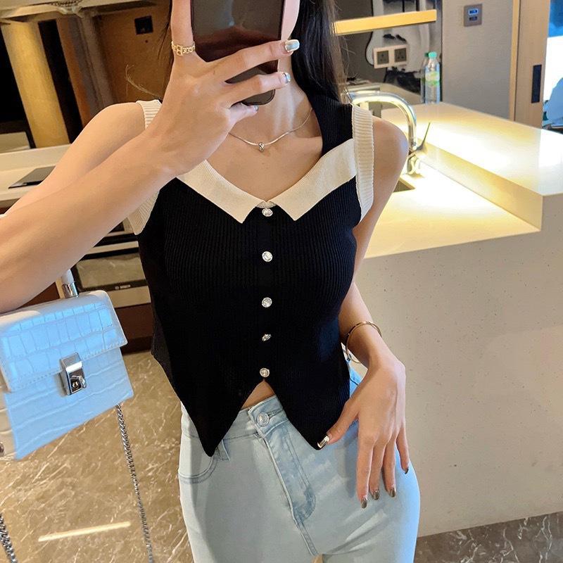 Летняя новинка, сексуальная, темпераментная, контрастного цвета, квадратный воротник, маленькая рубашка, трикотажная, жилет-халтер, женская блузка