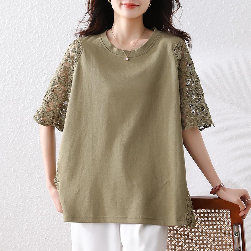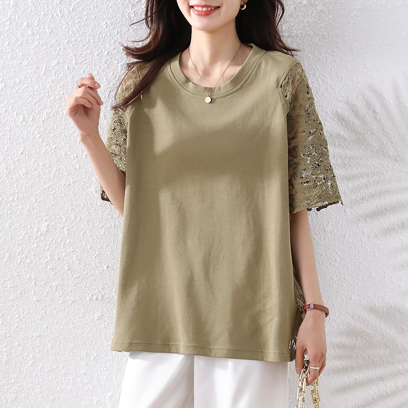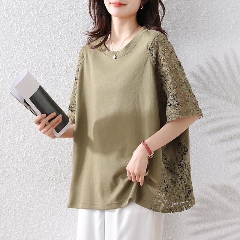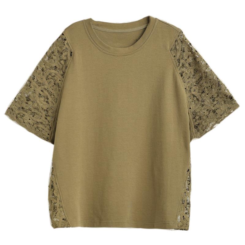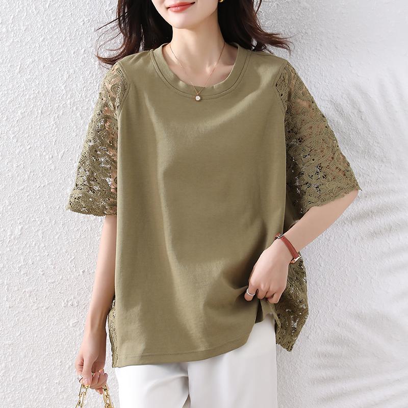 DIMANAF 2025 Летние Топы Большого Размера Хлопковая Футболка с Кружевом и О-образным Вырезом Женские Однотонные Футболки с Коротким Рукавом Свободного Кроя