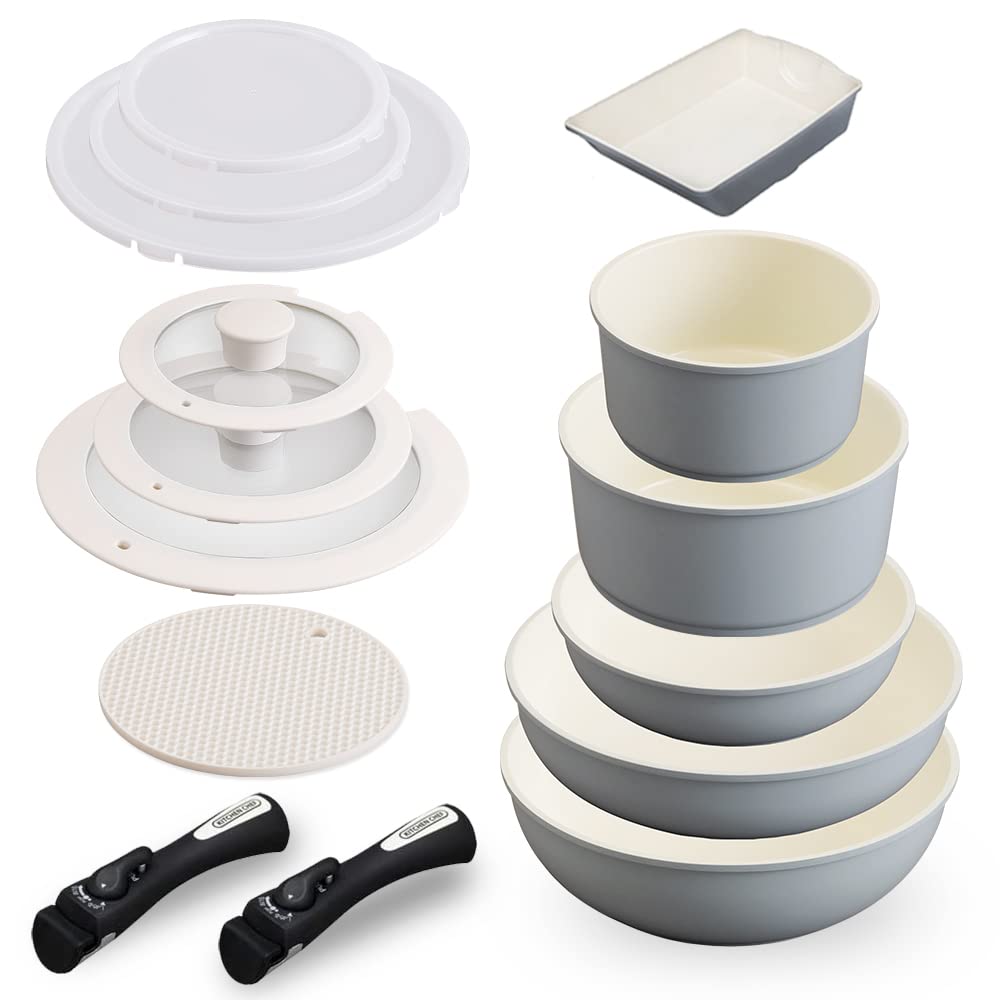 Установить содержимое: сковорода для жарки 26 см · 20 см / сковорода для жарки 26 см / сковорода 20 см · 16 см / яичный хлеб / стеклянная крышка 26 см · 20 см · 16 см / крышка с полиэтиленовым уплотнением 26 см · 20 см · 16 см / многофункциональная ручка 2 шт.