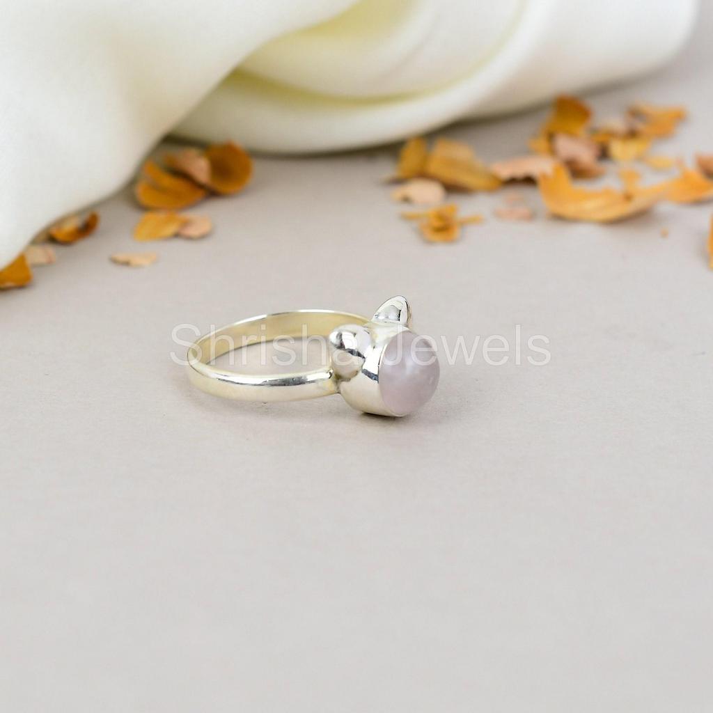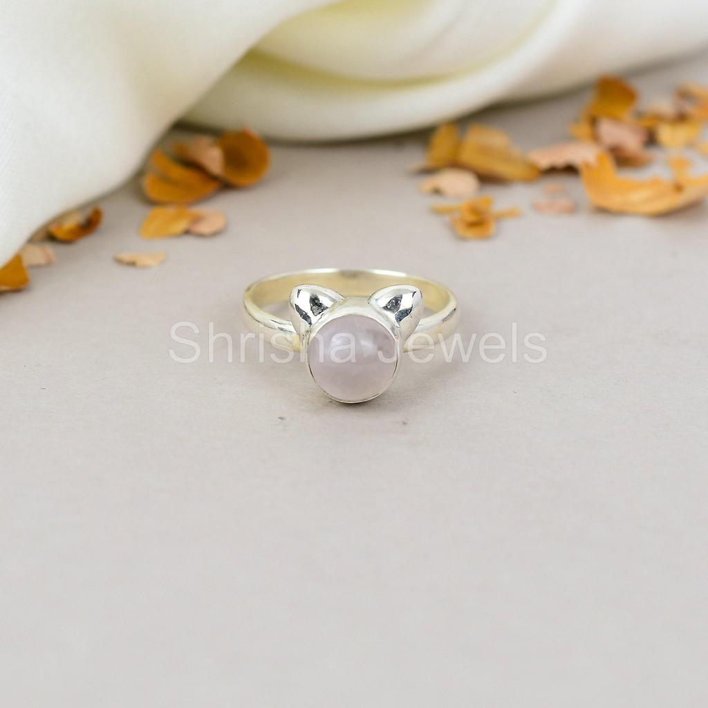 Rose Quartz 925 Sterling Silver Pink Gemstone Handmade Jewelry Cat Face Ring For Women