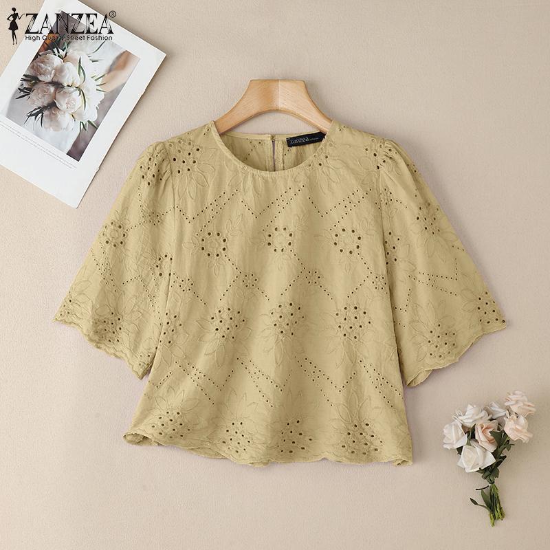 ZANZEA Женская повседневная блузка с круглым вырезом, короткими рукавами, кружевной вышивкой, летняя — купить товар онлайн с бесплатной доставкой по всему миру!