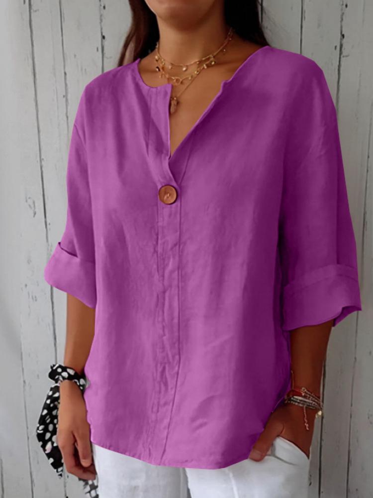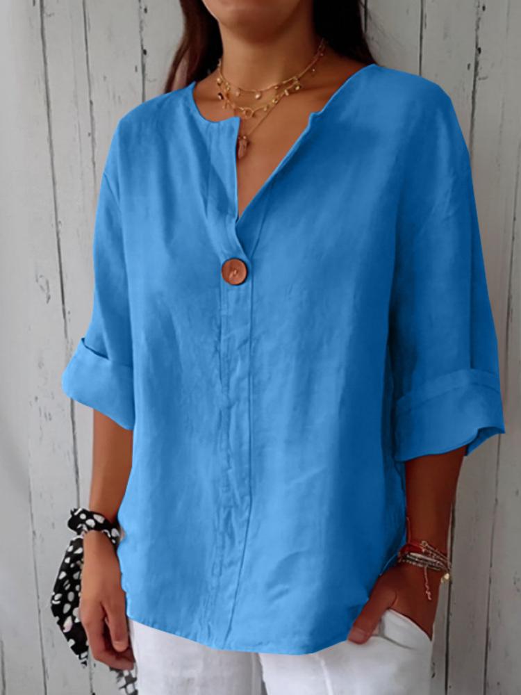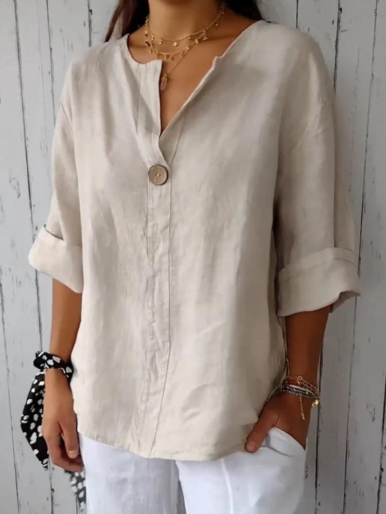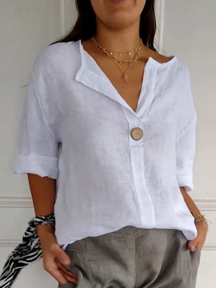 Летняя новая свободная футболка женская с V-образным вырезом из хлопка и льна на пуговицах