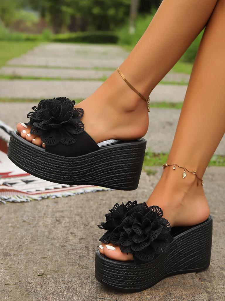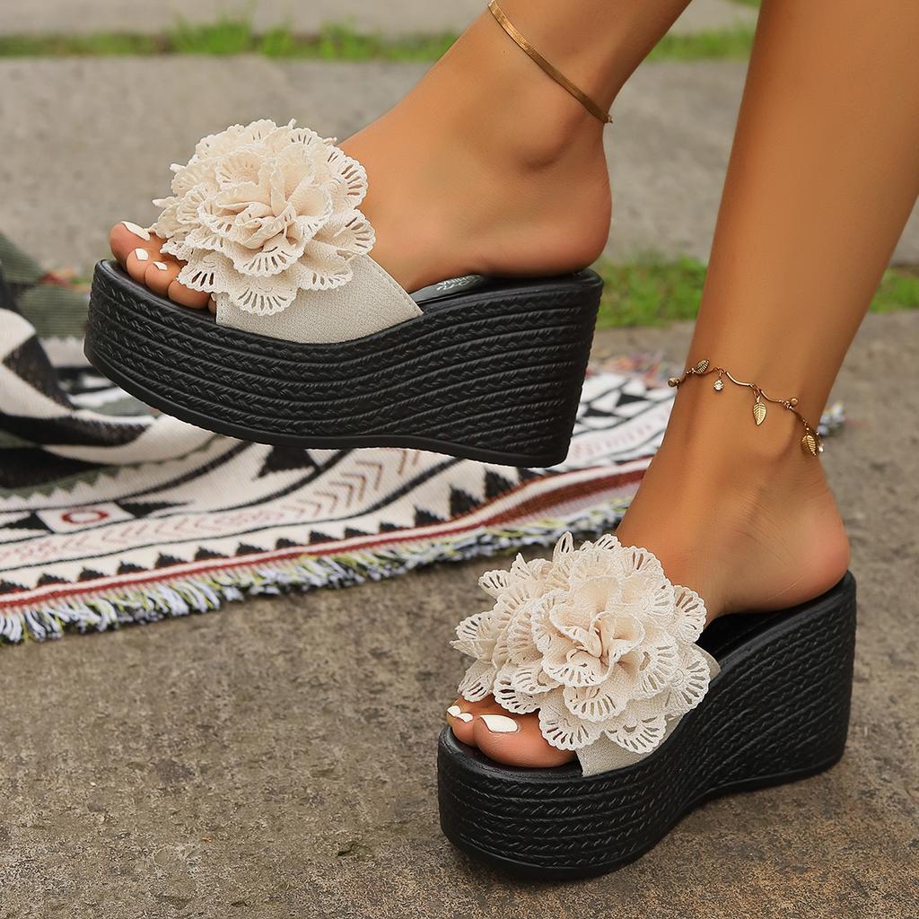 Большие размеры Женская обувь с открытым носком Женские тапочки Повседневные тапочки на платформе Женские цветочные с круглым носком Босоножки на очень высокой танкетке