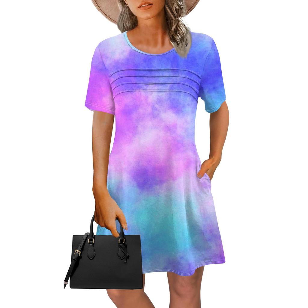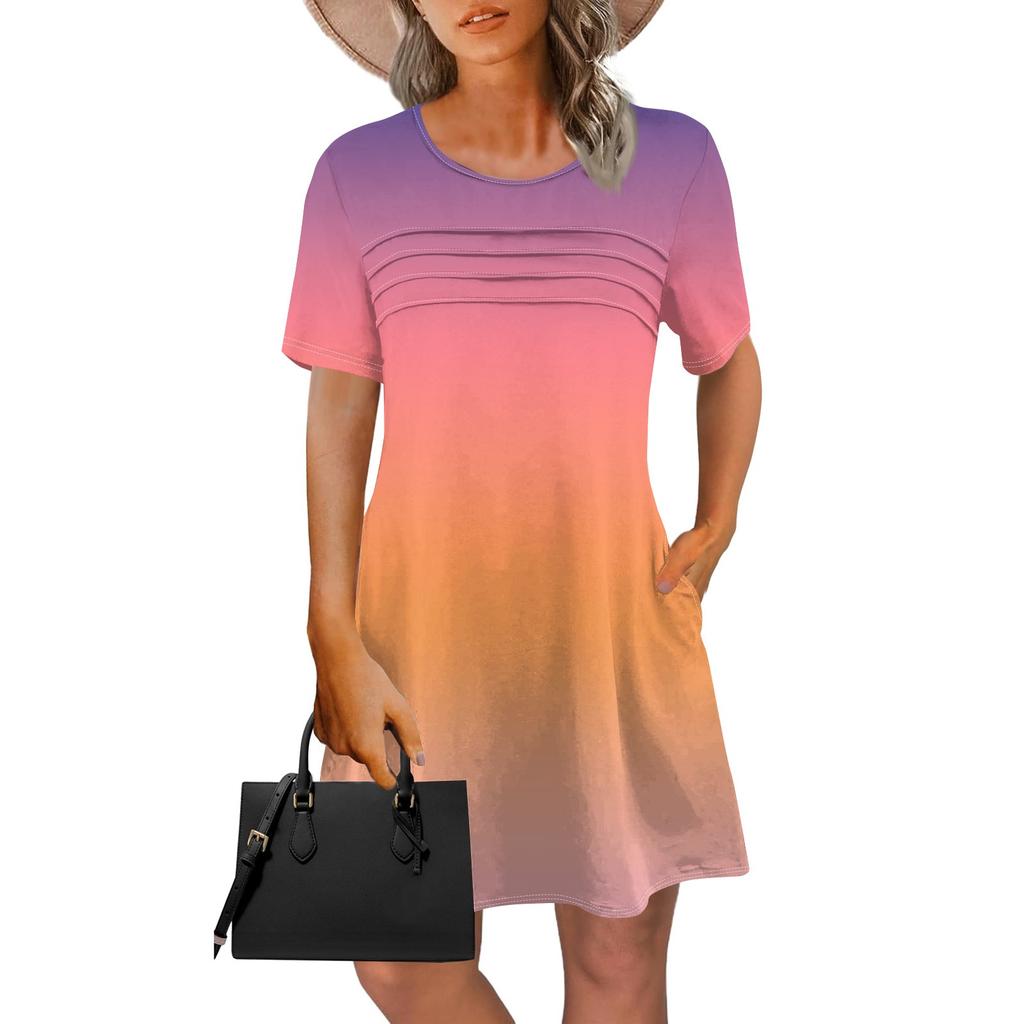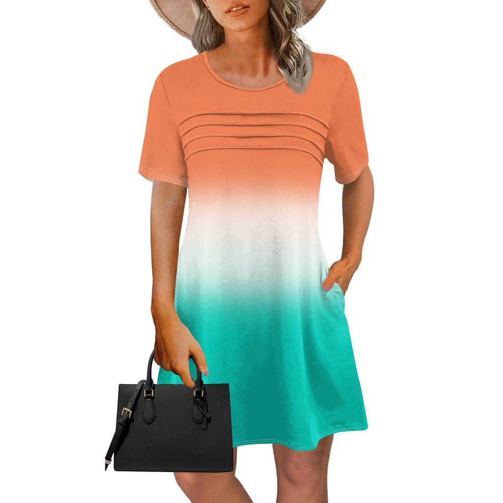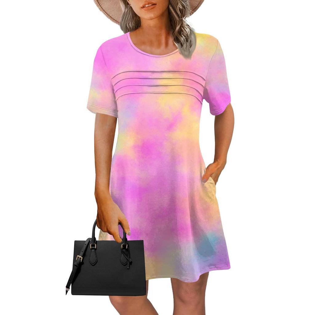 Женское летнее платье с градиентным принтом тай-дай, повседневное платье с короткими рукавами и круглыми карманами с завязками