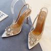 Модные женские босоножки с открытой пяткой из ПВХ с острым носком и стразами на высоком каблуке, сексуальные туфли для ночного клуба и вечеринки на пилоне