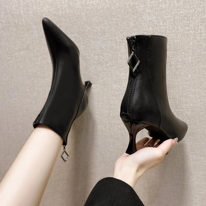 Туфли на высоком каблуке Ботинки с острым носком Черные ботильоны Модные ботильоны на тонком каблуке Ретро женская обувь Женские ботинки