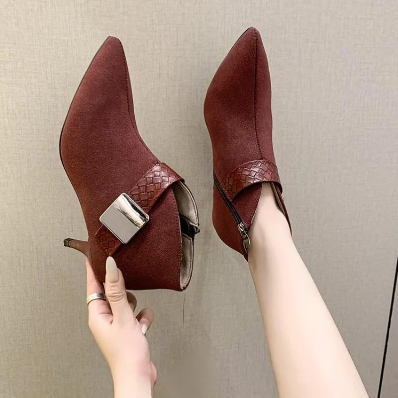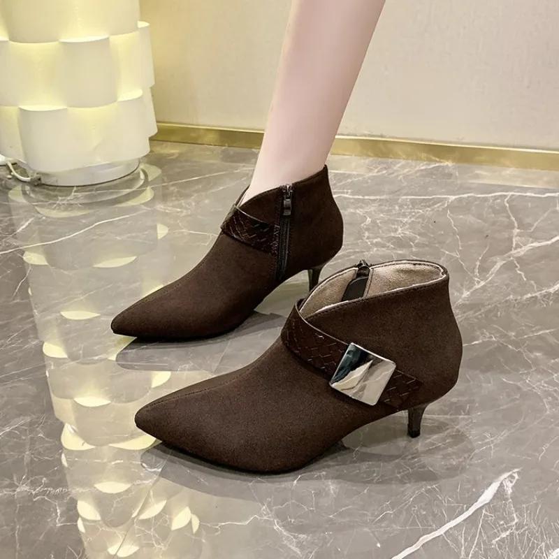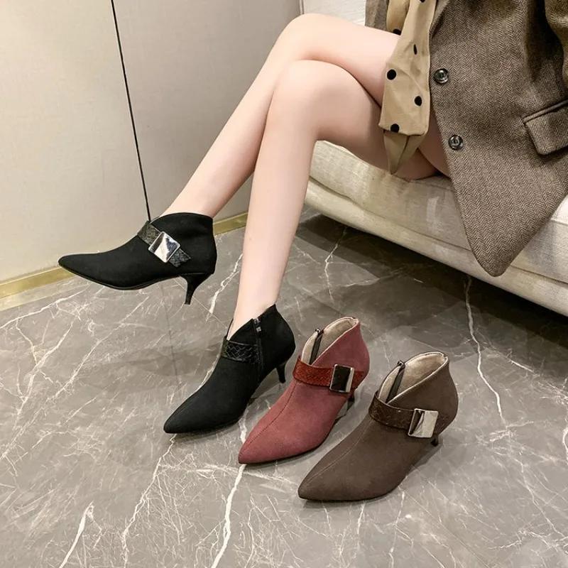 Зимние новые женские туфли на шпильках с острым носком короткие сапоги осенние корейские ботильоны популярные для женщин