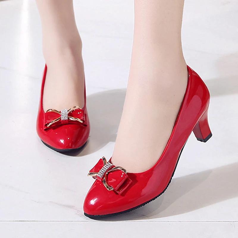 Женские туфли из лакированной кожи Туфли на высоком каблуке Офисные женские туфли на среднем каблуке Туфли с металлическим бантом