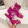 Сексуальные/клубные босоножки с открытым носком и квадратной головкой, украшенные стразами и перьями, женские летние узкие туфли для танцев на высоком каблуке с ремешком на щиколотке