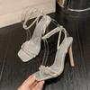 Сексуальные женские босоножки со стразами и пряжкой на щиколотке, летние туфли с квадратным носком и открытым носком, на тонком высоком каблуке, для банкета, выпускного вечера